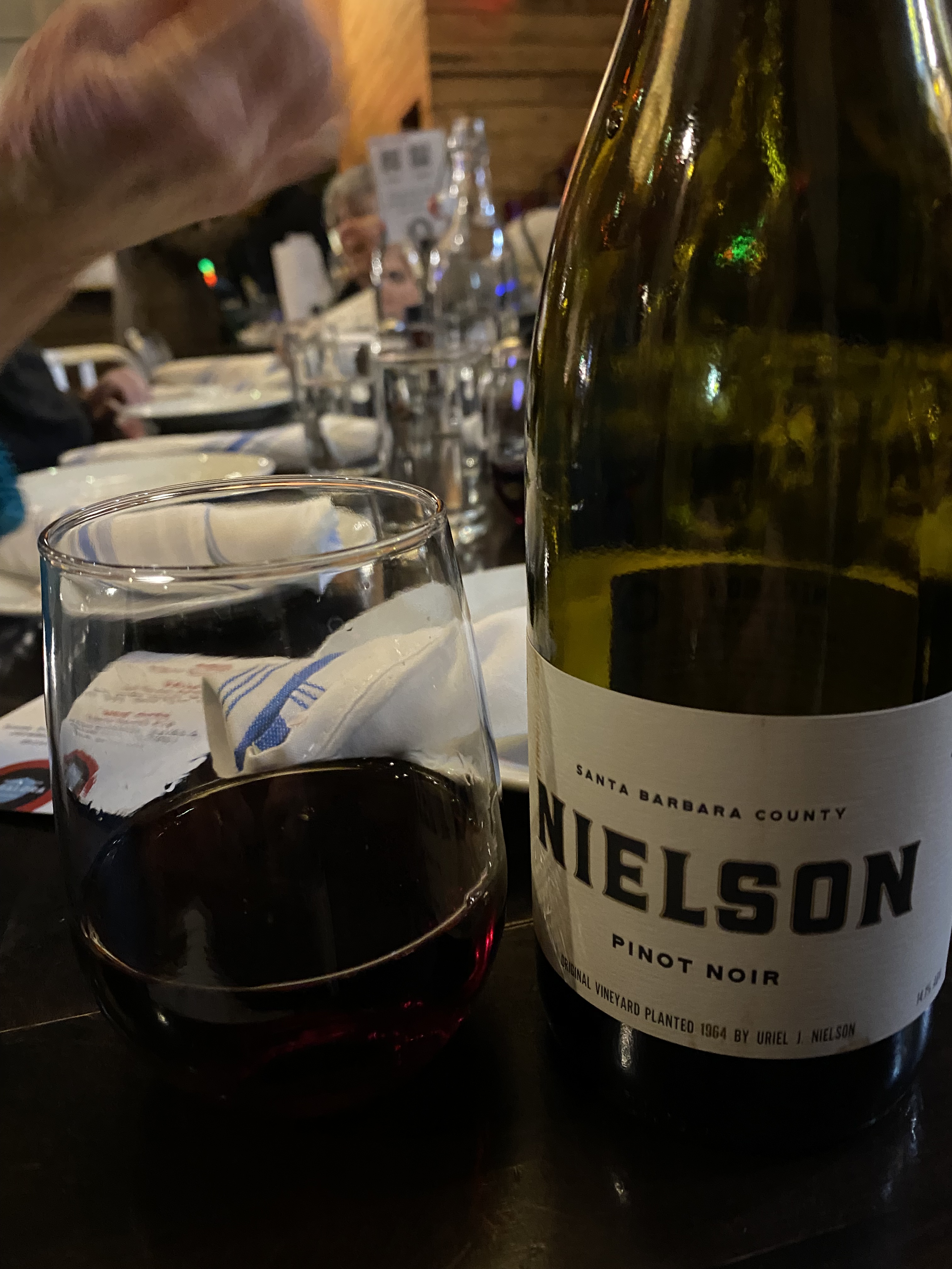 Biga, if you do crossword puzzles, refers to the pizza dough. The chef went to Italy and researched plenty of local pizzerias and small eateries to find the dough that he wanted. His quest was to find a dough that would not be heavy on the stomach as some could be, he wanted one that would be easily digested. After trial and error, as he has a complete kitchen in his headquarters, where he can experiment with new dishes or tweak older classics. The pizzas are perfect for two, or for one hungry individual. The other caveat is that he feels that the dough, because of its texture should only have a couple of toppings on each pizza. The other secret ingredient, which is right out in the open in each of his pizzerias is a large wood-fired oven for intense heat and flavor, this oven is so important that he has the same oven installed on two travelling busses that he rents out for parties. Down at our end of the table, a Pinot Noir was requested to start with. We had a bottle of Nielson Wines Pinot Noir Santa Barbara County 2021, which originally was called Byron Winery. Nielson Wines pays homage to Uriel J. Nielson, who in 1964 planted the first commercial vineyard in Santa Barbara County, against the common collective that the region was too cold for grapes; fifty years later, there are about a hundred wineries and thousands of acres of vineyards there. The vineyard is located eighteen miles from the ocean and is one of the first districts that witness the fog burn-off each morning. The winery is Certified Sustainable and they use small-lot techniques, such as hand-pruning, block by block harvesting, barrel fermentations and aging on the lees. A garnet-colored wine that offered notes of red fruit, and a touch of tea leaf. On the palate tones of red fruit permeate, with a bit of sweet caramel and a soft finish of terroir.