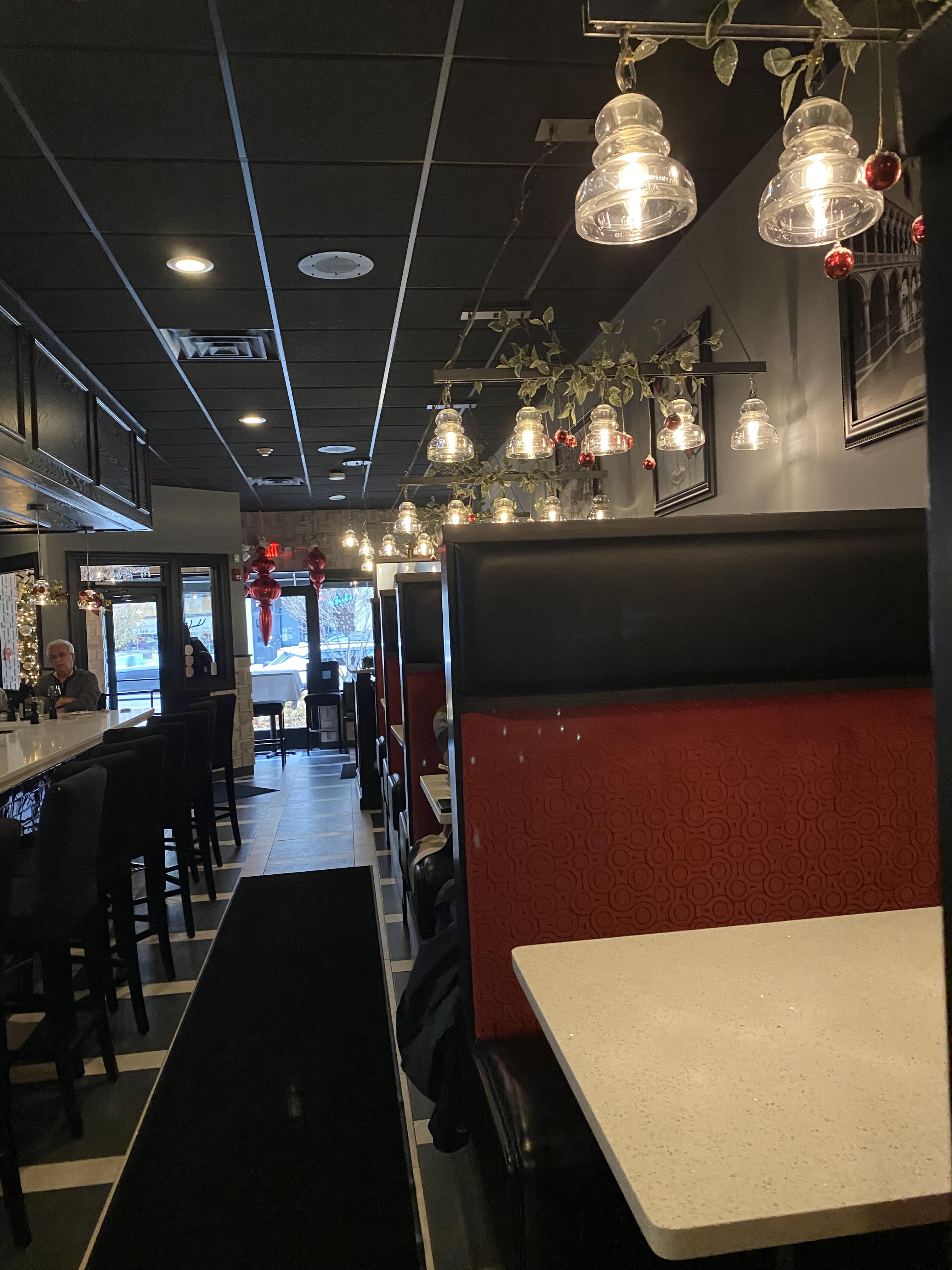 The restaurant had two parts, a long narrow bar side with booths, and the adjacent restaurant with tables and booths; we sat in the restaurant at a table and commandeered a booth to hold all the stuff we had bought at the bakery. We are very casual diners and food tends to get shared, so we just ordered a couple of appetizers to start off with, along with the bread. We had an order of Shrimp Luca, jumbo shrimp lightly breaded and flash-fried topped with a lemon garlic cream sauce and an order of Calamari, flash-fried and served with homemade aioli sauces. We then all ended up with pasta orders; Pasta Rustica with sautéed Italian sausage, red onions, banana peppers and spinach in a roasted garlic marinara sauce tossed with penne pasta; Lobster Ravioli with claw meat stuffed saffron pasta, tossed with shrimp, spinach, and roasted tomatoes in a Sherry cream sauce; Pasta Primavera, penne pasta sautéed with onions, tri-color peppers, mushrooms, and cherry tomatoes tossed in a garlic, olive oil, fresh herbs and lemon sauce; and Shrimp and Sausage Scampi with sautéed jumbo shrimp and Italian sausage with artichokes, asparagus tips, sliced garlic and fresh herbs in a white wine lemon butter sauce on fettuccine pasta. All followed by sorbets and “Baked Alaska” with Neapolitan ice cream center.