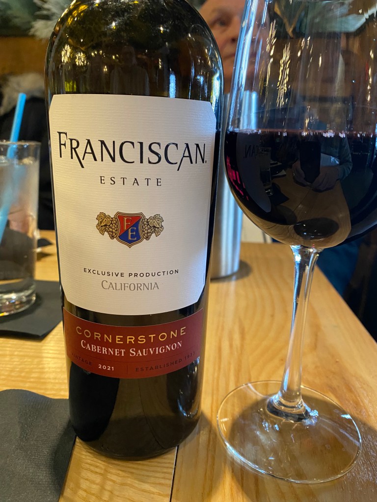 For the main dishes, it was across the board from burger and sliders, to steaks and salmon. Though for dessert, the flourless chocolate cake seemed to be the winner, and the coffee was done French-press. My Bride is fond of this restaurant, as it is one of the restaurants that she meets her friends, as they go to the mall for their walking regimens. I also ordered a red wine to go with all of the dinners, though this restaurant is very beer oriented. We had a bottle of Franciscan Estate Cornerstone Cabernet Sauvignon California 2021. Franciscan Estate was established in 1973 by Justin Meyer, who was the winemaker at Silver Oak Winery and with the help of Augustin Huneeus, owner of Quintessa Winery. They began with two-hundred-forty acres in what is now the Oakville appellation, along with contracts across the Napa Valley. They are famed for their flagship Magnificat Cabernet Sauvignon blend. The winery is now owned by E&J Gallo who has become a buyer of quality properties these days. I couldn’t find any production notes for this wine and because it carries a California appellation, I will surmise that it is a bulk wine production, but I was pleased with the wine. It was a deep-dark red wine that offered notes of blackberry, plum and touches of black tea, and clove. On the palate, a rich “jammy” wine of black fruit with a touch of caramel and chocolate and a decent finish of fruit. For a popular priced wine, I found no objections to it, and the people at the table all seemed to enjoy it.