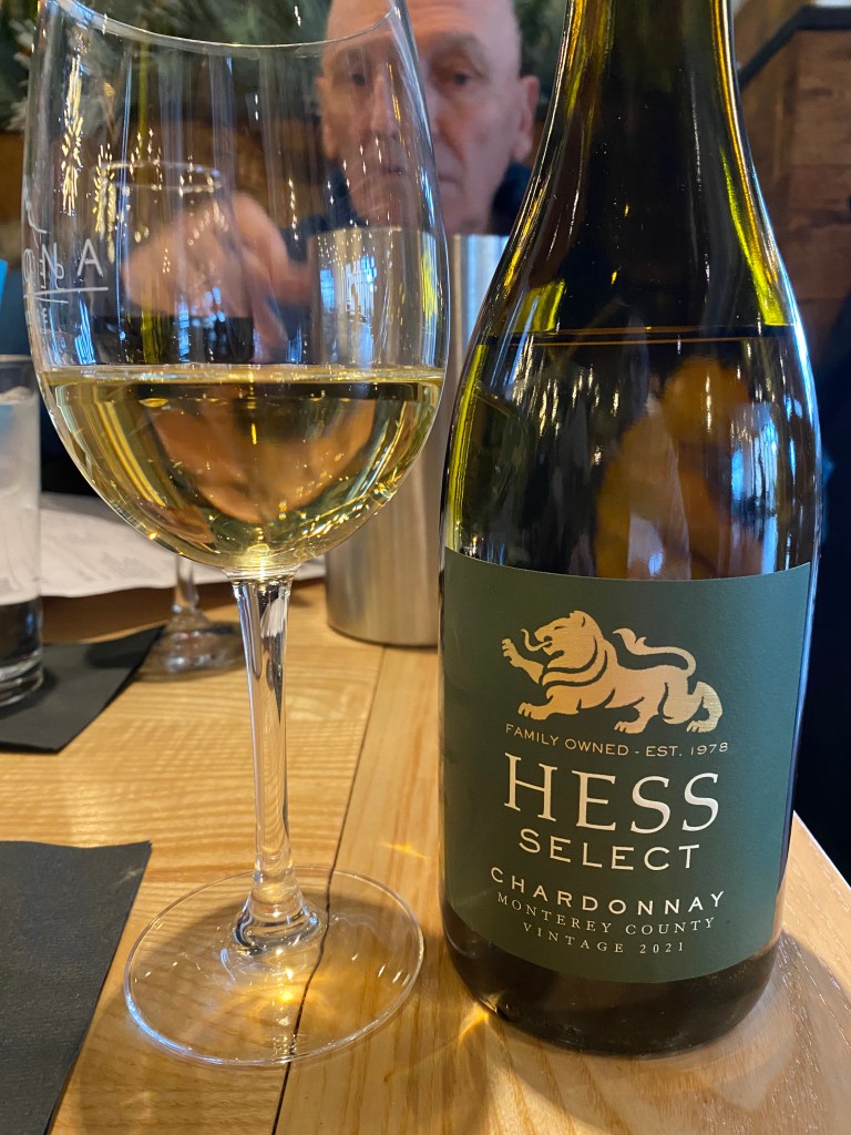 My Bride and I got to the mall, where the restaurant was, and we walked the premises upstairs and downstairs to get some our “steps” in. We got to the restaurant about ten minutes early, but they wouldn’t seat us, until the specific time and after there was a few more to arrive for our party, as they had allotted us two hours for the dinner. I thought it was rude of them, but I stayed civil. We were finally seated and everyone tried to make some sense of the menu and we started out with some appetizers. To begin with, I ordered a bottle of Hess Select Chardonnay Monterey County 2021, part of the Hess Family Estates of Napa, which is now Hass Persson Estates; as Ms. Yoga loves Chardonnay. Donald Hess began the saga in 1978 with an original purchase of nine-hundred-one acres of land in what is now Mount Veeder in Napa Valley and with land to remain underdeveloped in support of local wildlife. In 2008, it was one of the first ten wineries to receive a Napa Green certification and they have continued to strive for other designations since them. They have survived the Napa Earthquake, fires and mudslides, which all led to renovations and upgrades to the winery, the visitor center and the art museum for the now renamed Hess Persson Estate, to acknowledge his daughter Sabrina and husband Tim Persson. They created the Hess Select division when they entered Monterey County. This wine is a blending of their Chardonnay grapes, using seventy-five percent aged in Stainless Steel and twenty-five percent in new French Oak. I have been a fan of Monterey County for Chardonnay and Pinot Noir wines, because of the ideal climate of cooling fog, coastal breezes and a longer growing season. A pretty golden-yellow color that offered notes of pineapple, star fruit and vanilla. On the palate there were notes of peaches, golden delicious apples with great acidity and balance, a crisp wine that proclaims Monterey and not Napa. It was very refreshing and tasty, especially for a popular priced wine.