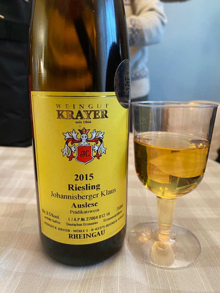 We brought some wines to share for the evening, and during the appetizer portion of dinner, one of the wines we brought with a nephew in mind was Weingut Krayer Johannisberger Klaus Auslese 2015.  The first mention of the Johannisberg vineyards was in 817, but it was in the 12th Century that the region was named after John the Baptist.  This region of the Rheingau, Johannisberg has four Grosse Lage (great location); Schloss Johannisberger, Klaus, Holle and Mittelholle. The vineyards are made up of loess and loam soils derived from the nearby Taunus mountains.  The Klaus vineyard is just under one hectare of south-facing land on a slight incline at the foot of the hill.  It has deep calcareous loess and gravel deposits.  The winery was founded in 1866 and family run.  Auslese is a later picking of the grapes and they show the noble rot that is prominent for the region.  A golden colored wine that offers notes of white fruit, elderflower and saffron.  On the palate, this is an off-dry wine with tones of peach, apple, and apricot, fresh acidity; a lighter, softer wine with a decent count finish of fruit and mineral terroir.