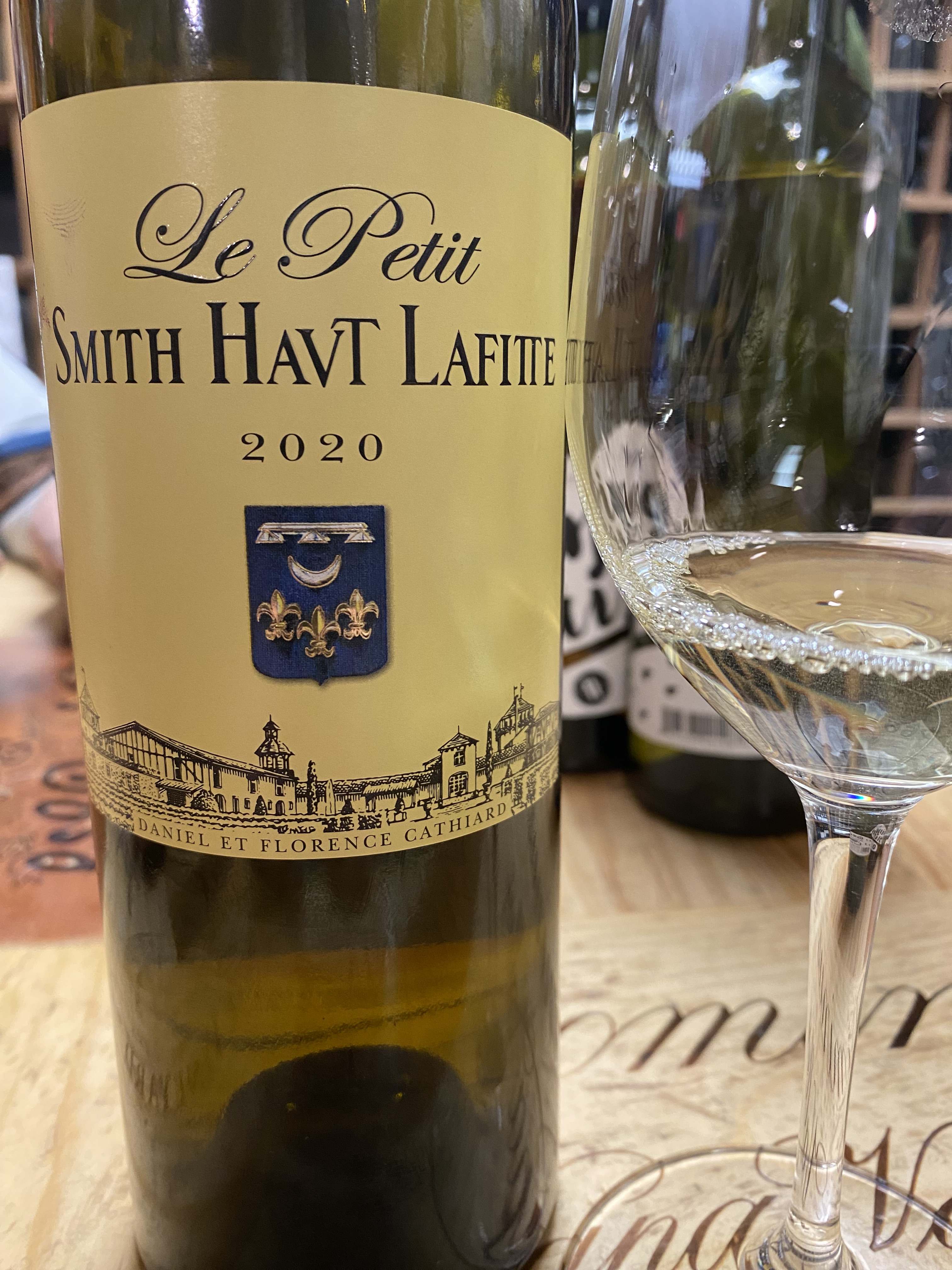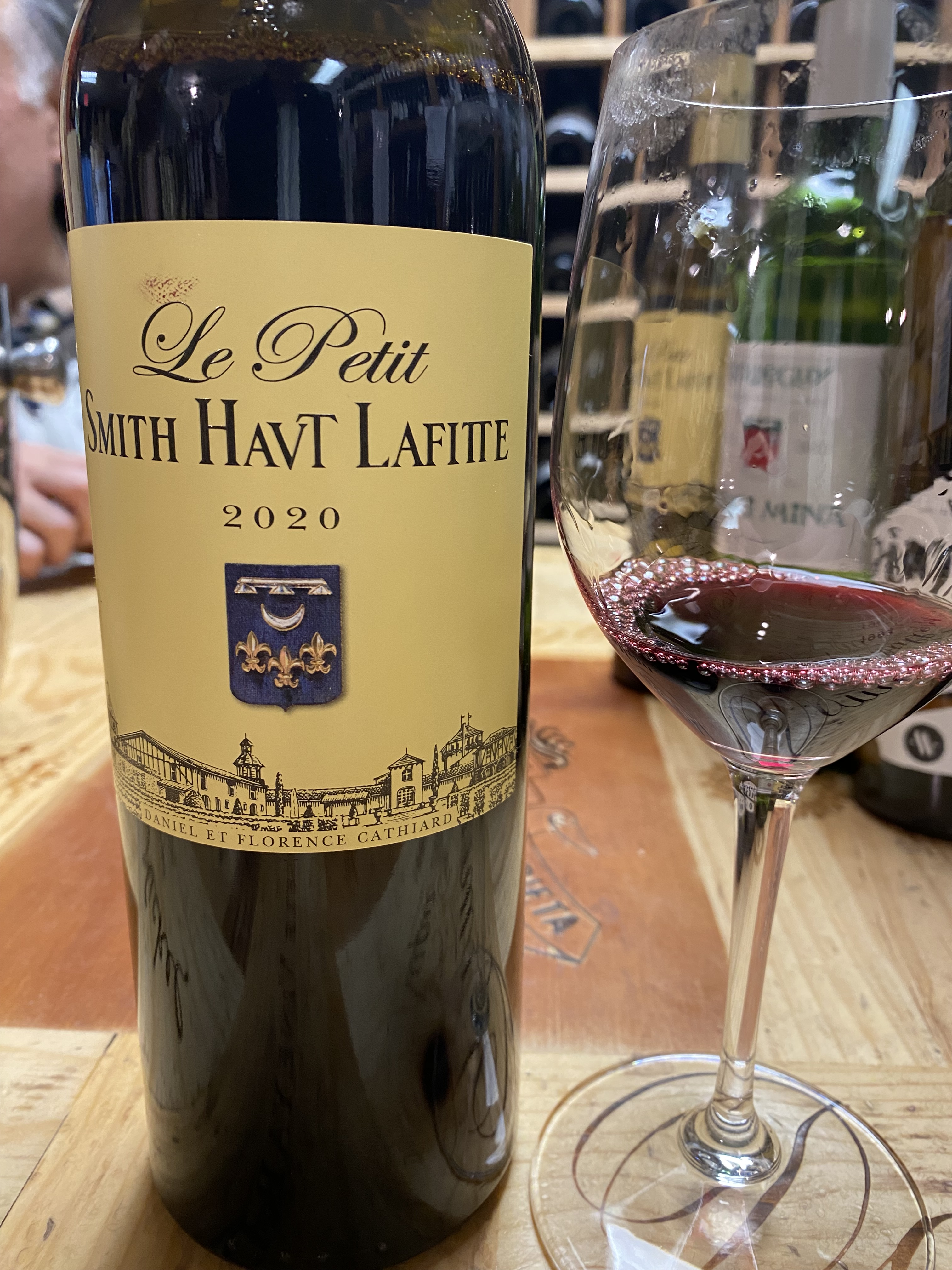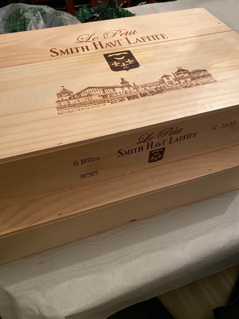 Then we followed with a tasting of Chateau Smith Haut Lafitte Le Petit Smith Haut Lafitte Rouge Pessac-Leognan 2020 and this wine was originally labeled as Le Petit Haut Lafitte Rouge. The estate uses more than one-hundred hand pickers to select the grapes, and the picking dates are influenced by a row-by-row imaging from the Oenoview satellite system. The also employ a Vistalysis optical scan for each berry, to remove lesser-quality fruit. The estate is famed for having one of the largest underground cellars in Bordeaux. The fruit is from a thirty-hectare lot, that furnishes all the red wines produced for the estate. The wine is a blend of sixty percent Cabernet Sauvignon and forty percent Merlot. The grapes are sorted twice, before and after destemming; and are not pressed before undergoing fermentation in vats. Tannins and color are extracted by punching down and/or pumping over for a period of fourteen months, with twenty percent new barrels. A deep garnet colored wine offering notes of black fruits, licorice, and dark chocolate. On the palate there were tones of plums, cherries, currants, chocolate, licorice with a sense of smoky, silky tannins and a nice medium count finish. Even though this wine was medium-bodied it was so lush and rich, easy to see it in the cellar for twenty years. We ended up with a nice wooden six-pack of each.
