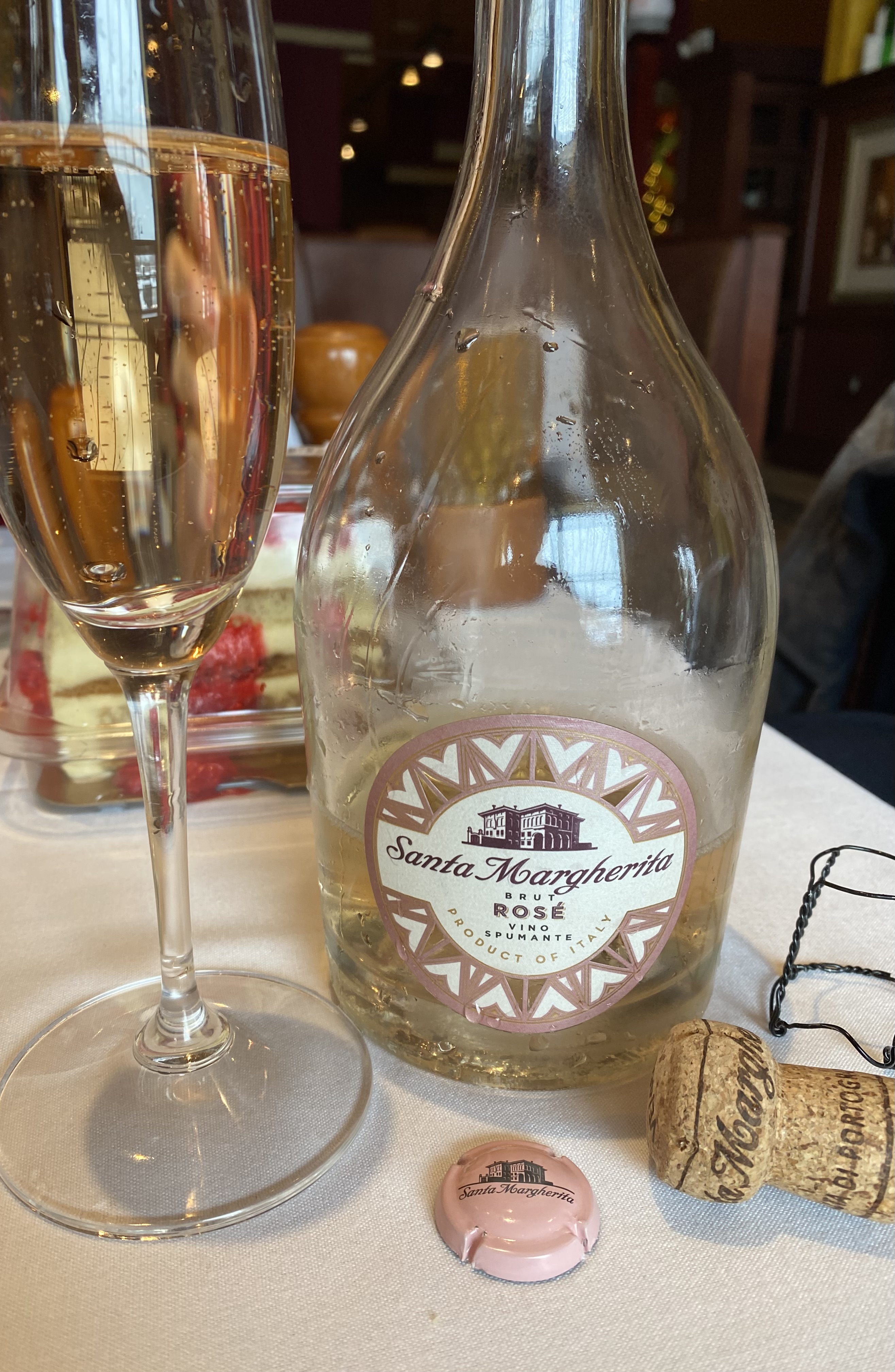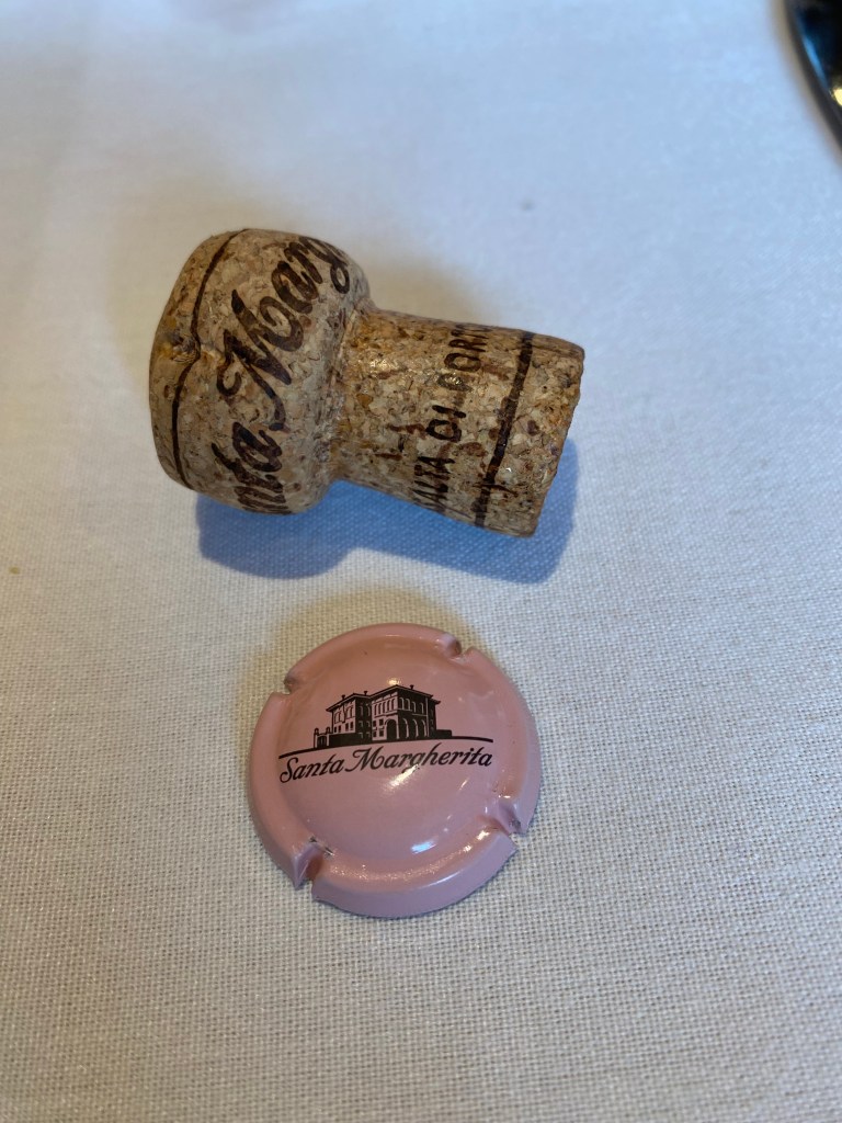 My Bride was trying to handicap my selection of wines, as if I was a rookie.  I knew it was early and the Birthday Girl is not a big drinker, so I went with something easy and fun.  I selected a bottle of Santa Margherita Brut Rose Vino Spumante NV.  Santa Margherita is located in northern Italy.  It was founded in 1935 by Gaetano Marzotto and they are famed for their Pinot Grigio wines.  In 1965, he applied traditional white winemaking methods to the Pink Grigio and created the signature light, crisp wine that they are known for, and they are the international market leader for the last fifty years.  In doing some research the winery website on two different platforms, list the three grapes differently; one page it is listed as Glera, Chardonnay and Malbech (Malbec) and on the other as Glera, Chardonnay and Pinot Nero (Noire).  The Pinot Nero or Noire is the more traditional grape found in the sparkling wines.  The base grape is Glera, as it is not from the appellation-controlled regions of Prosecco.  Whichever three grape combination that is used, the fruit comes from the Valle dell ’Adige and eastern Vento and from basically alluvial soils common to the region. The wine is a blend of a base white wine with a rosé produced from a brief maceration of red grapes with their skins.  Second Fermentation takes place in horizontal pressurized tanks for about a month and then the wine is cooled to halt additional fermentation and then aged on the lees in the tank for about three months.  A pinkish-coppery colored wine with decent amount of smaller bubbles offered notes of red fruit and pink florals.  On the palate a crisp delicate wine that would be best described as berries and cream, and very easy drinking with a short finish of fresh fruit and flowers.  As I was attempting to be a pain, taking a photo, the waitress started to remove the cage, cork and muselet; and I asked her to leave the muselet and she knew what I was talking about.  All in all, it was a great lunch and birthday celebration.
