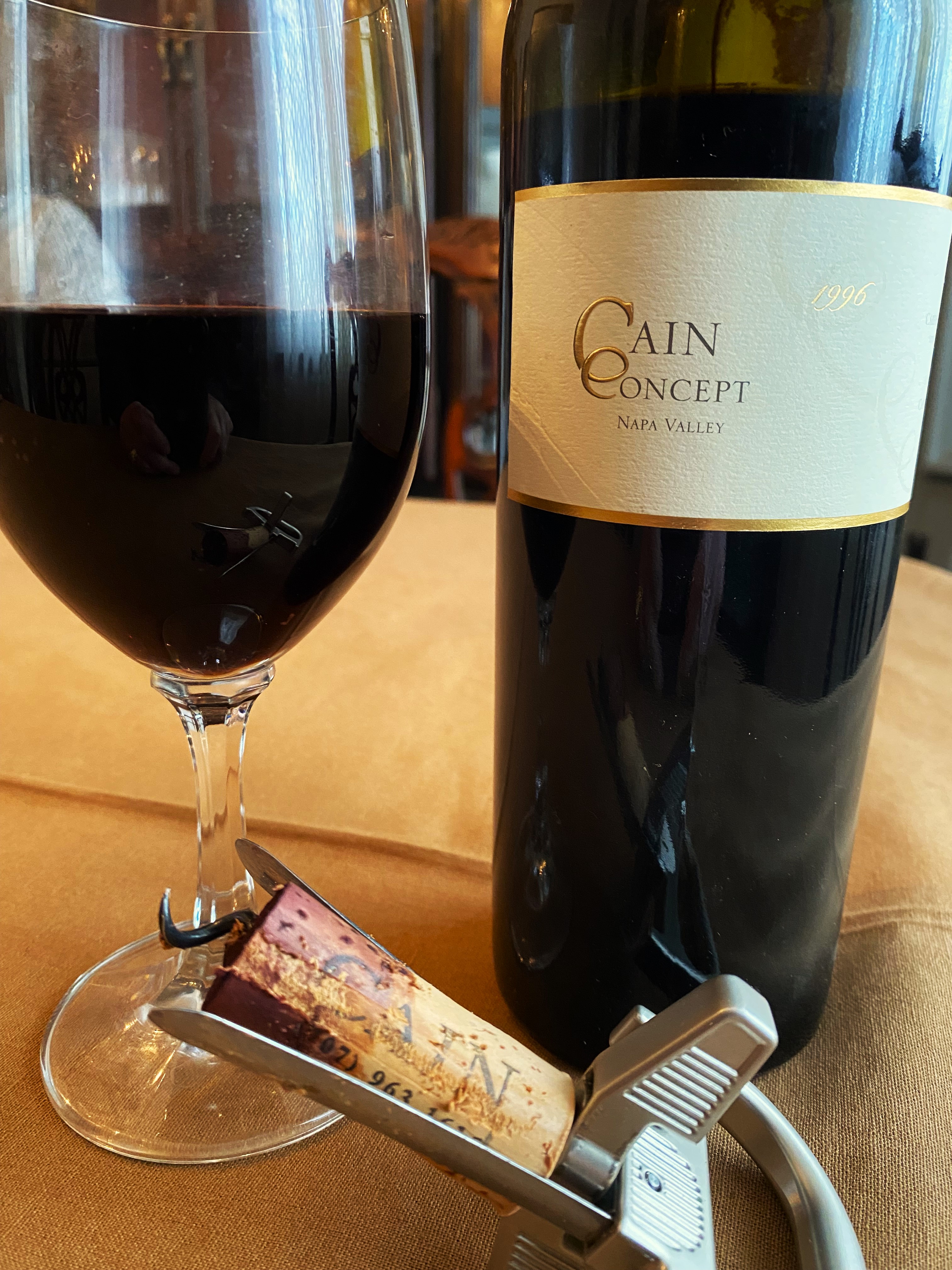 We moved into the dining room for dinner, and began with a Caesar Salad, followed by Roast Beef, with sides of Armenian Pilaf and Sautéed Fennel and Onions. Since the meal was during Lent, my Bride went to a baker and got an assortment of cookies, so that the heathen would be pleased, as the heathen only gives up, what is missing in the house during Lent. I was looking forward to the Cain Vineyard and Winery Cain Concept Napa Valley 1996 and I opened the bottle, just prior to our guests arriving and since the wine was thirty-years old, I used my Durand, but the cork was firm and solid. In 1997 the wine’s label was changed and since then it is Cain Concept “The Benchland” and it is a project to show what Cain Five would be, if it was not a mountain wine. Cain began in 1980 when Jerry and Joyce Cain purchased 550 acres of the McCormick Ranch on Spring Mountain, where it was a sheep farm. It is the top of Spring Mountain AVA and adjacent to the Sonoma border. The first release was 1985. While Cain Vineyard is located at the crest of the Mayacamas Range overlooking Napa Valley, Cain Concept (The Benchland) is at the foot of the mountain side from Yountville to Oakville to Rutherford to St. Helena. The fruit is harvested from the following vineyards: Beckstoffer, Cain, Claes, Kenefick, Stagecoach and York Creek. The winery, heritage barn and housing on the property, as well as the 2019 and 2020 wines in the cellar, were entirely destroyed in 2020 by the Glass Fire, one of several wildfires that ripped through parts of Napa Valley. This vintage was a blend of seventy-eight percent Cabernet Sauvignon, seventeen percent Merlot and five percent Cabernet Franc. This wine like Cain Five requires over three years of production, before it is released. The wine was still a deep-inky colored wine with a bright red rim, and no foxing or aging in the color. The nose was still strong and offered notes of black and red fruits, scented with violets and traces of tobacco and spices. On the palate, at the age of thirty, there was still fruit, but not as dominate, with tones of cassis, blended with mature tannins, still balanced and with a lingering finish of terroir. I guess I should open the other bottle of this wine, and enjoy it, later this year.
