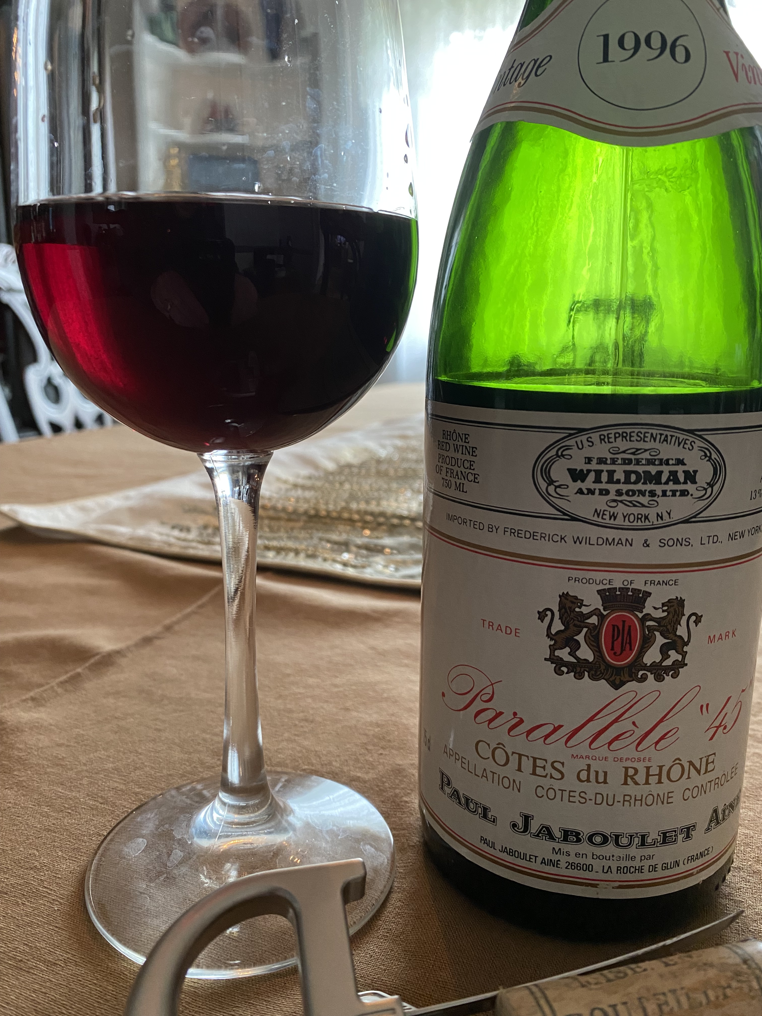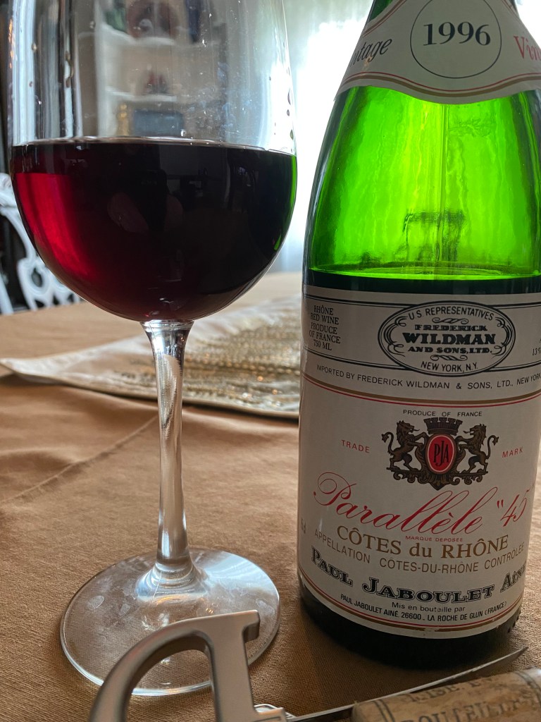 The dinner was focused on Roasted Pork Tenderloins, Breaded Chicken, and Broiled Salmon. We did have her original Caesar Salad, along with Armenian Pilaf (some of the nephews might do a coup d’etat if we didn’t have it), along with Fennel and Onions, Brussels Sprouts with Bacon, and a Scalloped Potato dish that also had Sweet Potatoes in the mixture. After dinner there was a huge assortment of desserts, pies, cakes, Paklava, Canolis and I am sure that I am missing something else. For dinner, I was a bit daring and selected Maison Paul Jaboulet Aine “Parallel 45” Cotes du Rhone 1996, knowing full well, that if there was a problem, I was sure to be able to find another bottle somewhere in the house. Paul Jaboulet Aine has been part of the Rhone Valley for almost two hundred years. In 1834, Antonie Jaboulet started with a small vineyard on the hills of Hermitage, and since then, it encompasses over one-hundred-hectares of vineyards from the northern to the southern part of the Rhone Valley. It was family owned until 2006 when it was purchased by the Franco-Swiss family of Jean-Jacques Frey; with holdings in Bordeaux, Burgundy, and the Valais. Parallel 45 is in the southern Rhone and named after the famous latitude that spans across France. The grounds are composed of clay, limestone and alluvial deposits and round pebbles. The grape varieties for this wine are Grenache, Syrah, Mourvedre, Marselan (which is a recent crossing of Grenache and Cabernet Sauvignon), and Carignan and the vines are now about forty years of age, so they were about ten years of age, when this wine was produced. The fruit is hand-harvested. The Syrah is vinified separately with maceration and soft extraction for about three weeks, while the other varieties are co-fermented with the Grenache for color and tannins. The wine was aged for six months in Stainless Steel vats on fine lees. The wine still had fruit. It had a deep red color with no apparent foxing and offered very subtle notes of red fruit and spices. On the palette there were tones of red fruit, soft blended tannins with a soft finish of terroir. After decanted into the glasses, there was still plenty left in the bottle of sediment and dregs and there were about four full pours of the wine. I am quite sure that almost all of the wines from the Nineties onward were all purchased and cellared immediately here, with only occasional jostling of the bottles during restocking exercises in futility as I would periodically attempt to keep up to date with the cellar.