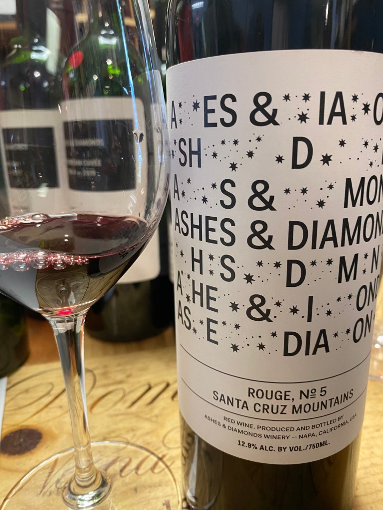 The second wine we had was Ashes & Diamonds Vin Rouge, No. 5 Santa Cruz Mountains NV and is a Bordeaux blend style wine. It is seventy-two percent Cabernet Sauvignon, fifteen percent Merlot, and thirteen percent Cabernet Franc; and it is mostly 2019 vintage with some wine from 2018 and 2017. The fruit is from the Bates Ranch Vineyard in the Santa Cruz Mountains planted in 1972 at an elevation of 2,100 ft. elevation and sloping. The ranch practices organic dry farming on well-drained silt over iron-rich volcanic soils. The varieties are co-fermented with nine days of maceration, using indigenous yeasts, and aged in neutral French Oak; with six-hundred-seventy-five-cases produced. A deep garnet red wine that offers notes of black cherry and black currant, with traces of old leather and cocoa. On the palate rich tones of black cherry, cassis, blueberry, and vanilla with tight tannins and a medium count finish of fruit and terroir.