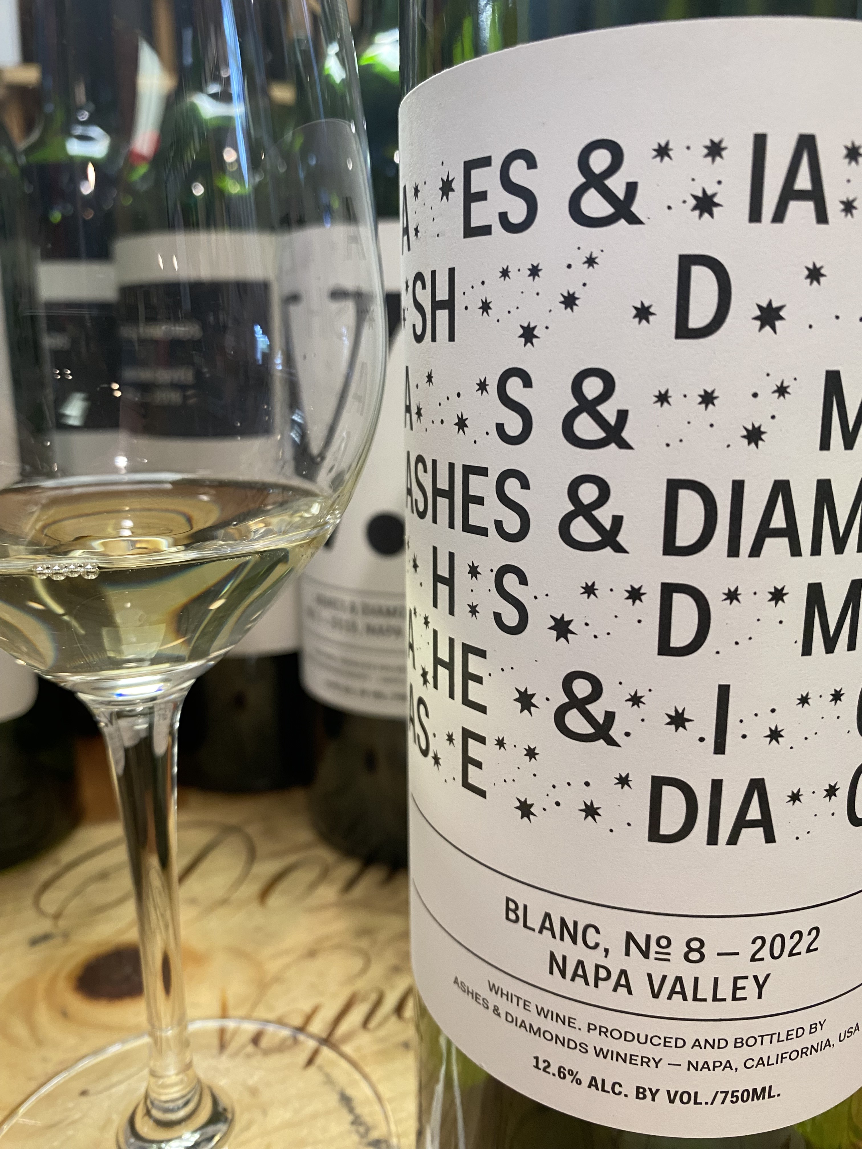 The first three wines were made by Steve Matthiason who has a M.S. from UC Davis and has consulted for such historic vineyards as Stag’s Leap Wine Cellars, Spottswoode Winery, the Araujo Estate and Dalla Valle Vineyards. The first wine was Ashes & Diamonds Winery Blanc No. 8 Napa Valley 2022. The wine is a blend of sixty-four percent Semillon and thirty-six percent Sauvignon Blanc, with the fruit coming from three vineyards in Napa Valley’s Oak Knoll District and Yountville. The wine is barrel fermented and aged for nine months in French Oak of which seventeen percent was new and they produced two-thousand cases. The wine is a pale-yellow and offers notes of citrus fruits, and tropical florals, with a refreshing lemon and lime influence. On the palate a balance wine with tones of green apple, honeysuckle, apricot, and a medium finish of mineral terroir.