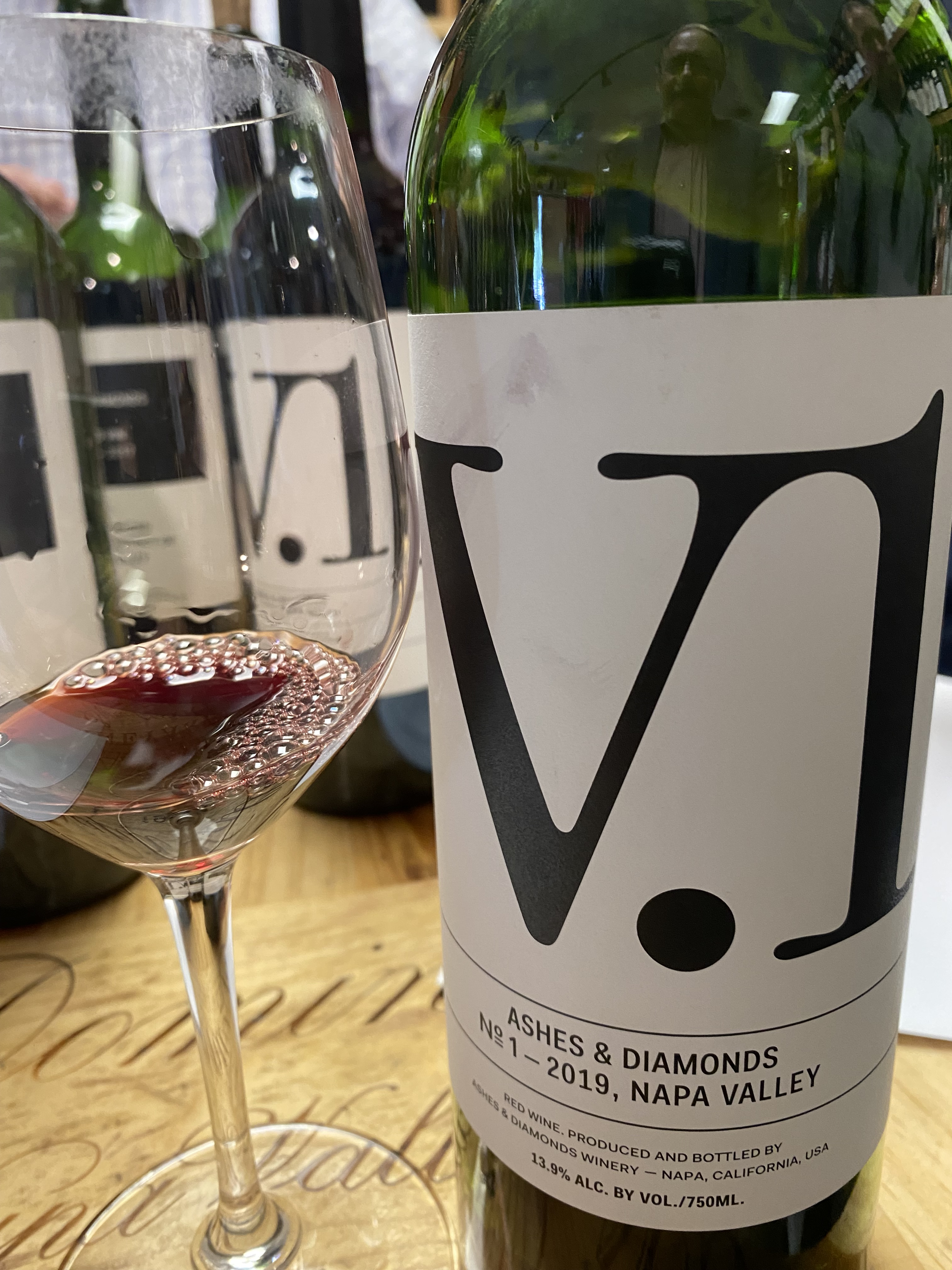 The final bottle of the tasting was Ashes & Diamonds Winery V. 1 Napa Valley 2019. This is their flagship wine and was a joint effort by winemakers Steve Matthiasson, Diana Snowden Seysses, and Dan Petroski. The wine is a blend of forty-eight percent Merlot, forty-one percent Cabernet Sauvignon, and eleven percent Cabernet Franc. The fruit has been sourced from select vineyards in Atlas Peak, Mount Veeder, and Ashes & Diamonds Estate Vineyard in Oak Knoll. The vineyards are farmed organically and biodynamically emphasizing sustainable practices. The fruit undergoes Maceration and Initial Fermentation in Stainless Steel for fifteen days with indigenous yeast. The wine is then aged for nineteen months in French Oak, of which thirty percent is new. There were four-hundred-twenty-two-cases produced. The wine was a deep ruby red color and offered notes of red and black fruits, cedar, and that ethereal sous-bois, the French wine terms evoking autumn woods, white truffles, mushrooms, and organic soil. On the palate there were rich tones of black cherry, plum, cassis, with secondary tones of oak, cedar, dried tobacco blending with silky tannins and finishing with a nice long finish of fruit and terroir. A great wine for cellaring.