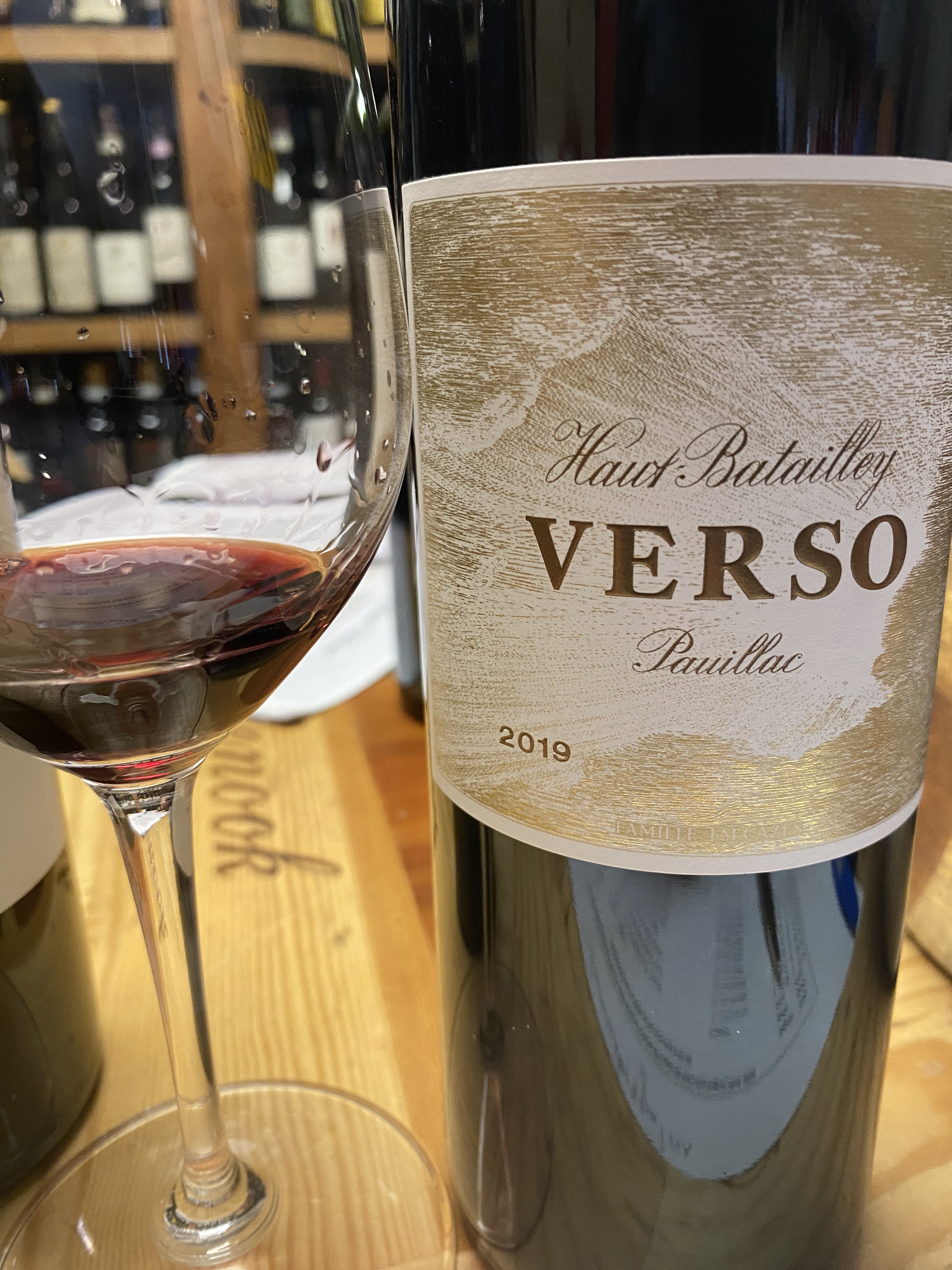The second wine of the tasting was Chateau Haut-Batailley “Verso” Pauillac. Chateau Haut-Batailley is a Fifth Growth from the Classification of 1855 of the Medoc. The actual vineyard of Chateau Haut-Batailley was defined in 1942, when the estate was divided into two separate properties (Batailley and Haut-Batailley). The estate now has forty-one hectares of deep Garonne gravel and planted with Cabernet Sauvignon, Merlot, and Petit Verdot. In 2017 the Caze family took over the estate. “Verso” is the second label of the estate. The wine is a blend of sixty-five percent Cabernet Sauvignon and thirty-five percent Merlot. The fruit is hand-harvested, sorted, and destemmed from a twenty-two-hectare property on the estate. Initial Fermentation and Maceration and vatting for three weeks, while Malolactic Fermentation began after the juice was transferred to one-year-old barrels for eight months. The dark ruby-red wine offered notes of red fruit and spices and herbs. On the palate this medium-bodied wine offered tones of currants, blended with other red fruits, oak, pepper, and fine-grained tannins and a medium count finish of fruit and a touch of terroir.