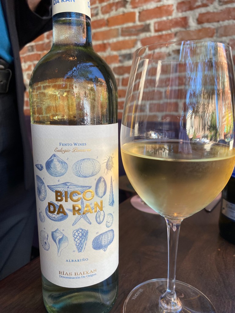 I suggested Aventura, a Spanish restaurant in downtown Ann Arbor, and off we went; and yes, I always look out of place wandering around the streets there. I don’t know if it was a positive or a negative, but the restaurant had us sit right at a window setting, so that pedestrians could see a couple dressed for dinner. Now, I am not sure if you have ever been to a “Tapas” restaurant, but you order a bunch of small plates and the dishes come out as the kitchen gets them done, I have never asked, if one could have the meal structured. We started with Pintxo Donostiarra (crab, tuna, spring onion, egg, aioli, Cristal bread), Setas a la Planxa (seared wild mushrooms, garlic, lemon, truffle oil, parsley), Pimentos de Padron (shishito peppers, Romesco, crispy garlic, lemon), and Croqueta de Jamon (Serrano ham croquettes, Romesco). We had to have two different wines, because of the variety of dishes. The white was Fento Wines Bico da Ran Albarino Rias Baixas 2022 by Eulogio Pomares. Fento Wines was created in 2012, originally only in Rias Baixas, but they are also now in the Dao region of Portugal. The vines are planted in the sandy granite soils of Galicia, and come from small winemakers under the guidance of Eulogio Pomares. The fruit comes from the Valle del Saines just off an estuary. The fruit is harvested in the morning, the must is cold fermented, cold stabilized, and filtered. A soft golden color wine that offered notes of white fruits, and citrus. On the palate tones of melon, pear, and lemon in a well-balanced wine that ended with great mouth-watering salinity and terroir.
