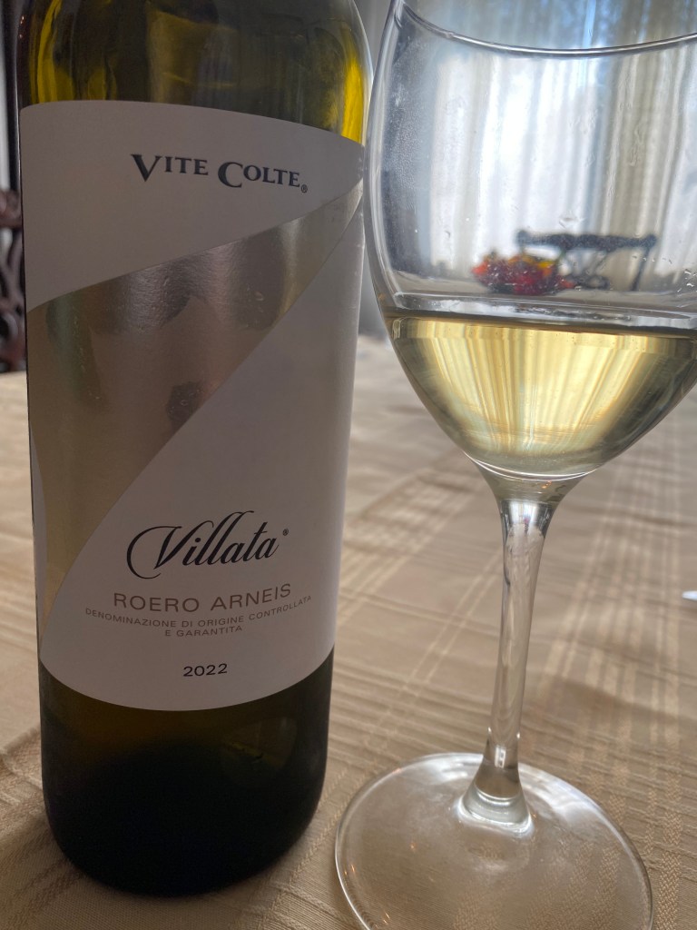 My Bride was getting the whole house ready for the party, of course we did have to replace the chairs in the breakfast nook, and she overdid the seats, I am not sure if First Class on Trans-Atlantic flights are this wide. Oh well, we have the living room and the family room for spreads of munchies and it keeps everyone from trying to squeeze into the nook. We had gone to a local cheese purveyor and she got a little carried away, but it was all good, but she did corner the market on the chocolate-cheese; she doesn’t like fudge, but she adores the cheese and to me, they taste so similar. She also had several other munchies to enjoy as well. We began with one of her favorite whites before dinner, Vite Colte Villata Roero Arneis DOCG 2022; which is owned by Terre da Vino in the heart of the Piedmont. Depending on the market this wine can be found either as Vite Colte or as Terre da Vino. Roero DOCG is a small district in the hills of the Piedmont, known for its refreshing whites made from Arneis, and for their bold red reds made from Nebbiolo. The district is named after the Roero family, who were powerful bankers in the Middle Ages. The classic Roero Bianco must be at least ninety-five percent Arneis, the other five percent can be any other local white varietal. They tend to grow the vines on the northern slopes of the hills, while Nebbiolo grows on the southern side on loose soils with a strong presence of silica. For a while, the grape almost became extinct, as all the interest was in the red wines. The grape can be difficult to grow and was often grown alongside the Nebbiolo, because its fruit was sweeter and the birds would feed on the white grapes and leave the red grapes alone. Traditionally a dash of Arneis was added to the Nebbiolo to soften the tannins, similar to how Viognier is used in parts of the Rhone. This wine was made from hand harvested grapes and it undergoes cold maceration and spends ten days on the lees in Stainless Steel. The wine is a pretty straw color, and the nose offered pears, lime zest, and white florals. The wine on the palate is very crisp and fresh with the notes of white fruit, a burst of tangerine and a tinge of hazelnut with a touch of minerals, peaches, and honey in the finish.