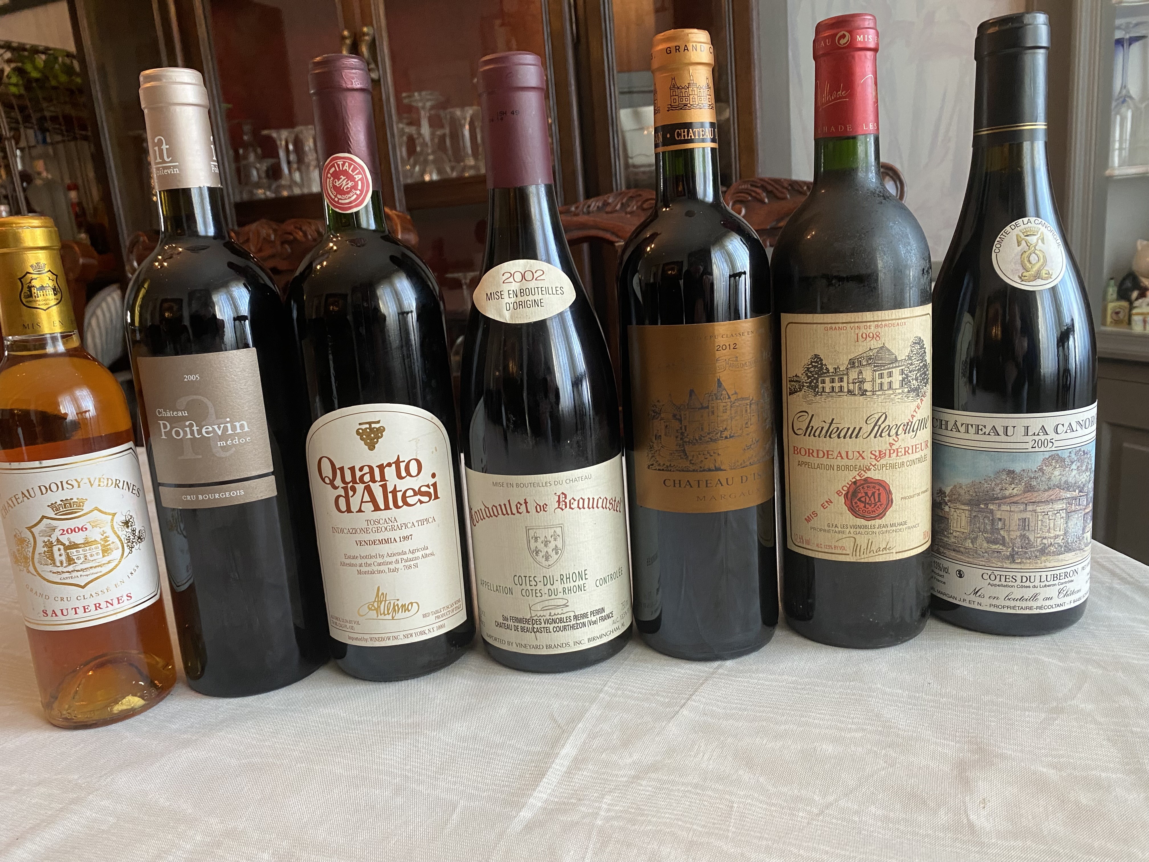 The other wines that we didn’t taste, but we added to our purchases were kind of a hodgepodge of interesting wines. I anticipate that I will be writing about these wines in the next couple of years and I look forward to the challenge. Chateau Doisy-Vedrines Grand Cru Classe Sauternes 2006. Chateau Poitevin Medoc Cru Bourgeois 2005. Altesino Quarto d’Altesi Toscana IGT 1997. Coudoulet de Beaucastel Cotes du Rhone 2002. Chateau D’Issan Grand Cru Classe Margaux 2012. Chateau Recougne Bordeaux Superieur 1998. Chateau La Canorgue Cotes du Luberon 2005.