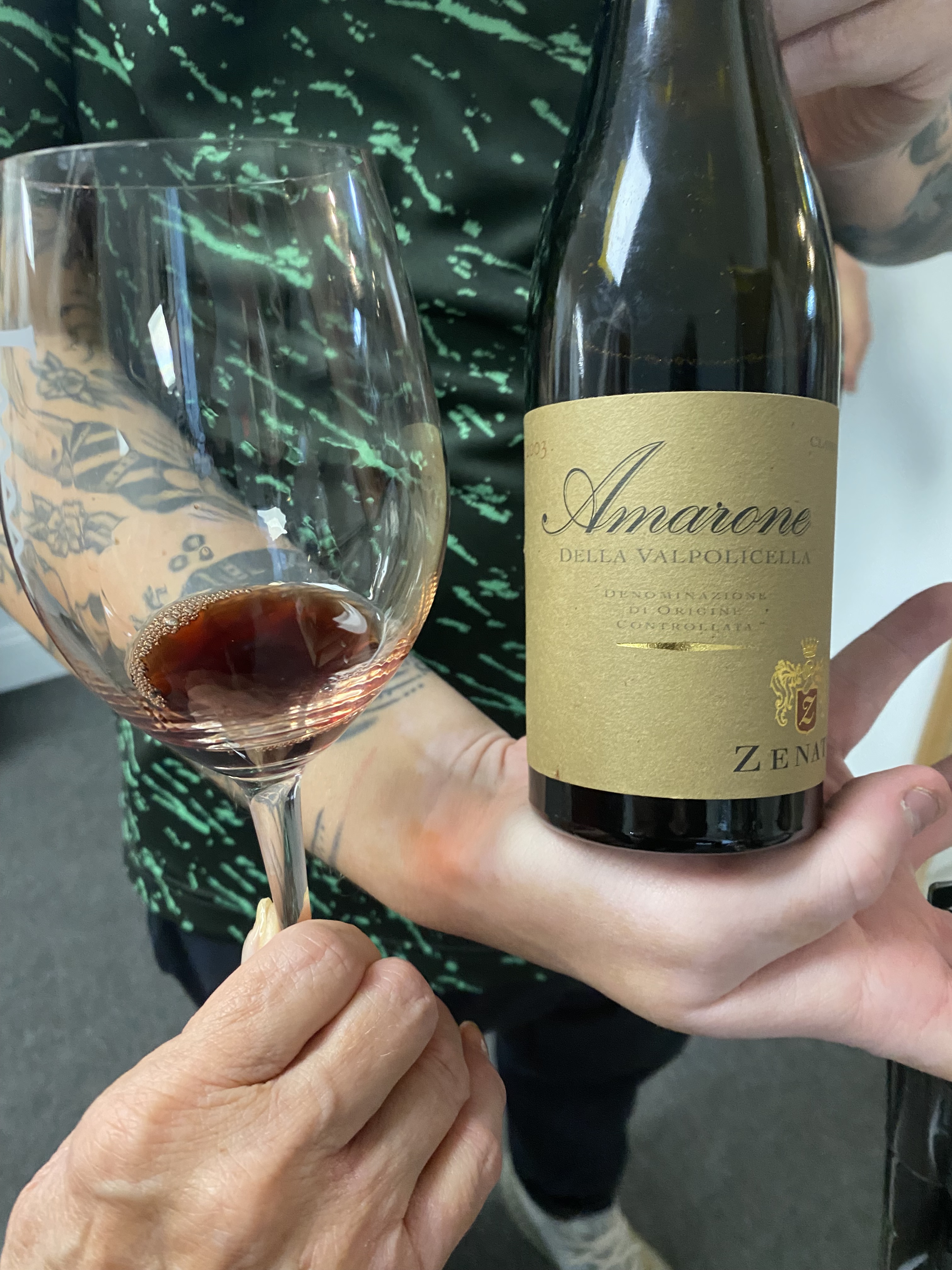 Another wine that was poured was Zenato Amarone della Valpolicella DOCG 2003. Zenato is an important producer in the Veneto, with estates in Lugana and Valpolicella. The Amarone wine is grown and made at their Costalunga estate at Sant’Ambrogio di Valpolicella. On the estate they grow Corvina, Rondinella, Oseleta, and Croatina and this wine is eighty percent Corvina and twenty percent Rondinella; and I guess a wink and a nod of Oseleta and Croatina. After harvest, the grapes are dried for three to four months, then crush in January and then aged for thirty-six months in Slovenian Oak barrels. This deep ruby-red wine offered notes of black cherry, figs, plums, cassis, florals, cinnamon, and almonds. On the palate this full bodied-wine had abundant tones of black ripe fruit, some strawberry jam, Christmas spices, grippy tannins, high acidity, with an ending of a good medium-count of ripe fruit, licorice, and a touch of bitter almonds and chestnuts.