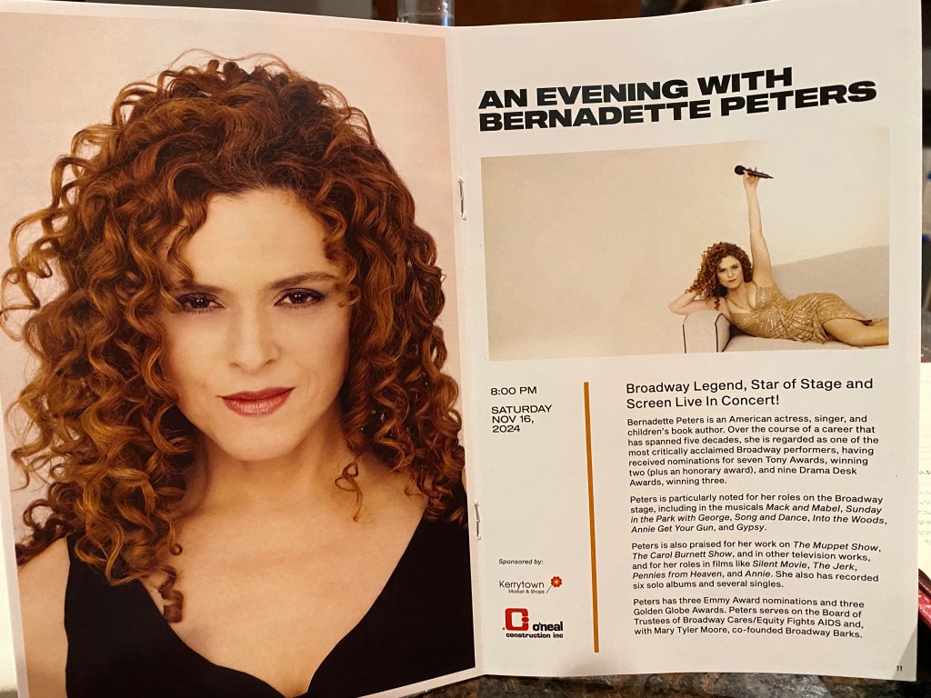 My Bride needs to gets plenty of support and praise from me, because I am, and will always be a pain in the arse about certain things.  While I know that she carries a torch for Jimmy Stewart and for Sam Elliot, she has put up with my crush for Sophia Loren and for Bernadette Peters.  Sophia came understandably from the years of going to “art films” with my parents as a child, and Sophia was a star, already by then; and for my 62nd birthday she took me to see a live session with Sophia, after a dinner downtown.  Now for Bernadette, in another life, I was sitting at a private table for two with my elbow that could rest on the main theater stage at the Riviera Casino and Hotel, to see the star Rich Little (from Windsor, Ontario, Canada) and his opening act was Bernadette, and there was a small set of stairs from the stage to the theater floor, and she came down those steps and leaned over my table and was singing only to me (at least that is how it felt at the moment); the second crush began that moment.  All of this is to set the stage, because we were having dinner at a restaurant that had changed hands, and while my Bride was away, I was checking on social media, and there was an ad for a one night only performance in Ann Arbor with Bernadette Peters.  I guess I have been a good boy, because we tried calling to get tickets, because the online process was rather convoluted, and we were told that if we got to the theater, before they closed that evening, we should be able to get the tickets.  It also gave us the reason to go have a wonderful after dinner drink that was not available, where we were at.