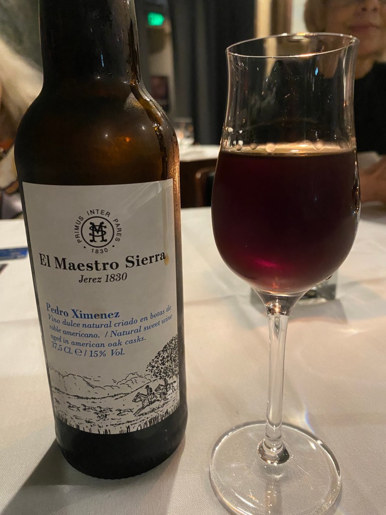 Then we settled for a three-way sharing of “Pawpaw Crème Brulee” with charred lemon curd and Maple Tuilé. As you can figure out, the Gold-dust Twins had the legendary Spanish Coffees that my Bride is such a fan of. I enjoyed a glass of El Maestro Sierra Jerez 1830 Pedro Ximenez Jerez de la Frontera NV. El Maestro Sierra is known for having one of the oldest soleras in the region, getting close to one-hundred-years. The bodega was established in 1830 by José Antonio Sierra, a master cooper for some of the other Sherry houses. For years, the production was sold to the larger Sherry houses, as they had sold their vineyards in the 1930s and 1940s; and then in 1992 when they had an inaugural bottling for export under their own brand. To this day, they still use an artisanal approach, and they even maintain their own in-house cooper. One of the key assets of the bodega is that it sits on the top of a bluff with full exposure to the winds from the Atlantic Ocean, which promotes a vigorous flor growth, flor is a crucial part of biological ageing of Sherry wines, and flor is a special blanket of yeast that lives on the top of a cask of sherry that feeds off of oxygen, basically a natural vacuum seal for the wine beneath it; which allows the wine to age almost forever in the solera system. Aged Sherry has a unique taste all its own, and this dark-amber colored wine offered notes of prunes, candied orange, candied cherry, nougat, and sweet spices. On the palate this slightly viscous wine offered tones of raisins, orange marmalade with a long-count finish of rich dried fruits and chocolate.