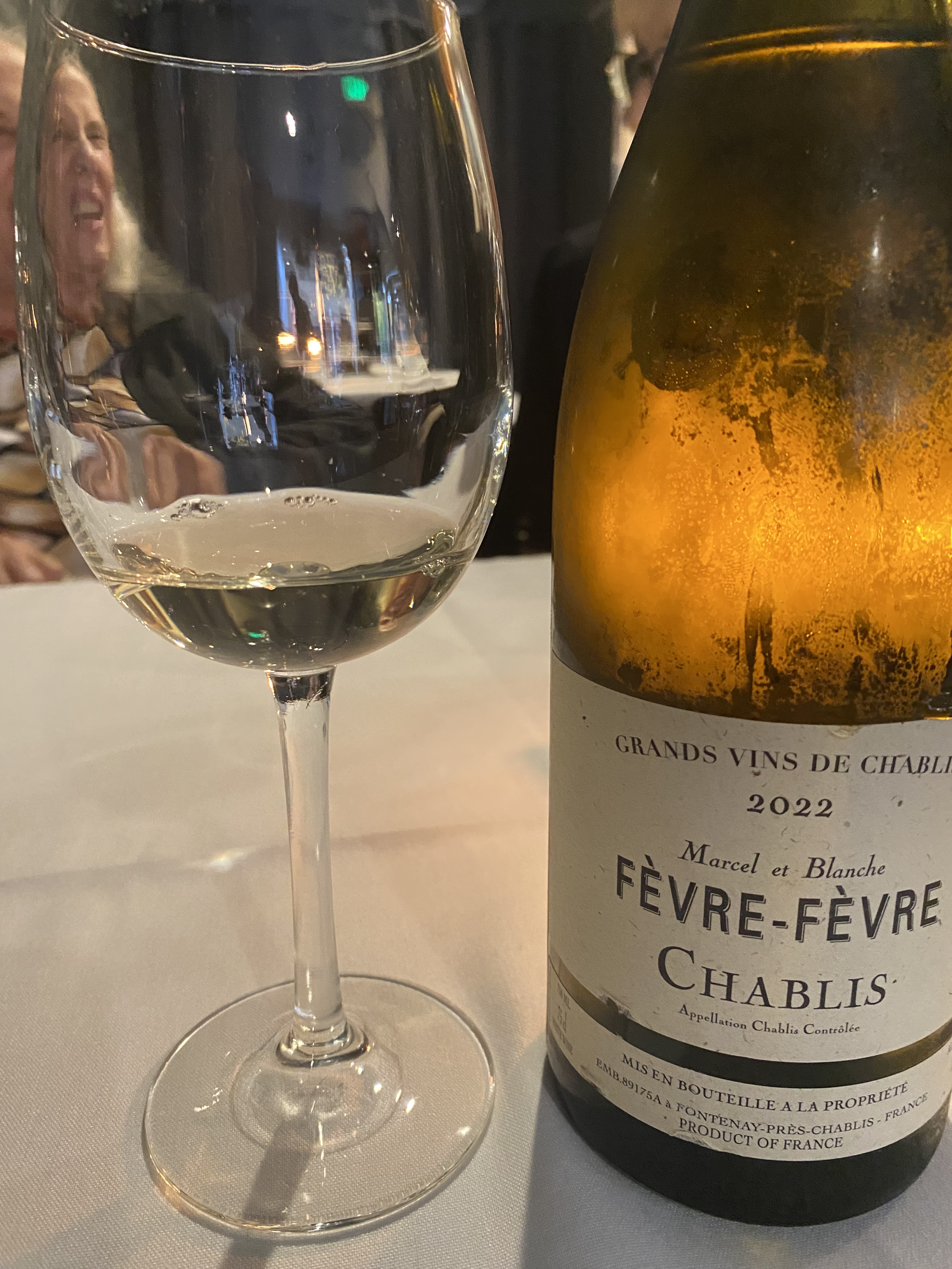 The ladies were having a good time and they both had the Seared Diver Scallops with Shiitake, apple, fennel, arugula, Miso-butternut Squash Purée, and coconut curry. I always have to be the odd one, and I had the Halibut with a vegetable Escabeche, marinated mussels, sunchoke purée, and chive oil. We then had Marcel et Blanche Fevre-Fevre Chablis 2022. This fifty-hectare estate is considered by some to be a benchmark independent winery. Gilles Fevre and his wife Nathalie, have been recently joined by their daughter Julie to become a fourth-generation winery. This is a proper family-owned domaine and not part of one of the large cooperatives. Thirty-three-hectares of the property is Village Chablis all on the classic Kimmeridgian limestone that the area is noted for; and no oak is used. This soft golden-yellow wine offered notes of citrus, stone fruit, tree fruit, sous-bois, spices, smoke, and minerals. On the palate, a very crisp wine with ample layers and tones of stone fruit, tree fruit, citrus and citrus zests, followed by tinges of earth, honey, mouth-watering salinity then finally ends with a good medium-count finish of a mineral-rich terroir.