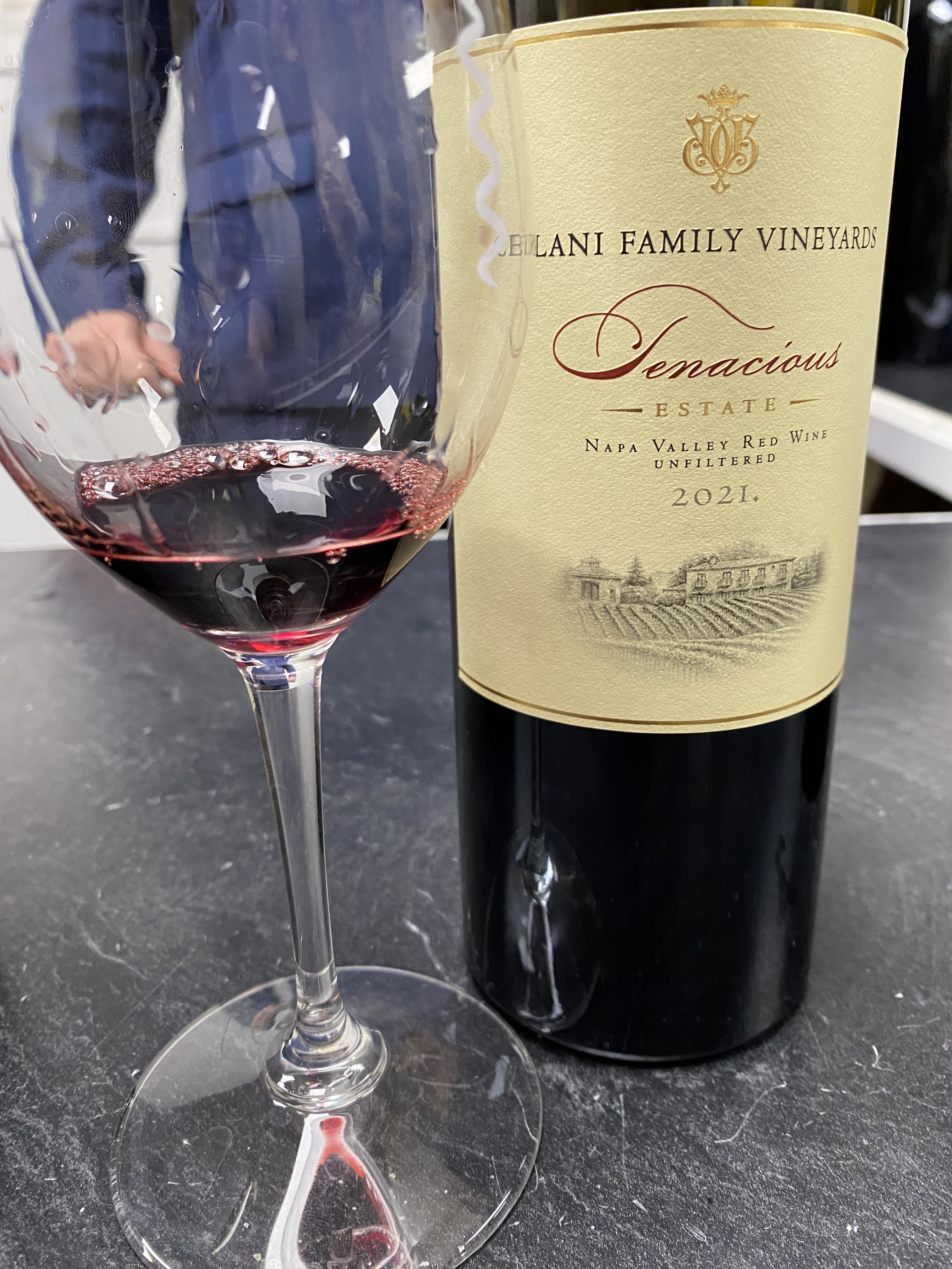 We then started with some red wines with Tom Celani and the first wine, I have probably introduced to more people than any other wine. I am talking about Celani Family Vineyards Robusto Proprietary Red Wine Napa Valley 2020. This is truly a Proprietary Red Blend, as there is no information even on the trade notes, but the winery grows Cabernet Sauvignon, Merlot and Cabernet Franc and they are partial to new French Oak. Though in talks with Tom at a couple of tastings, he told me that this vintage was pure Merlot. This was the first 2020 Napa Valley wine that I have had, and I could not detect any traces of smoke damage. This deep garnet wine offered notes of black plums, black cherries, and blackberries, along with notes of vanilla, tobacco, and chocolate. On the palate, this is a rather full-bodied wine for being affordable and the tones of the dark fruits, and traces of licorice, and orange peel; blended well with the softer tannins offering a fruit-forward, but not jammy wine that was easy to drink with the food, and ending with a good medium-count finish of fruit and spices and graphite (terroir). We then had the Celani Family Vineyards Tenacious Napa Valley Red Wine 2021. I had tasted and wrote about the Tenacious 2012 and the 2016 and we may have a bottle or two left of them in the cellar. When I first had the wine, I was told that it was created in the image of Le Pin and Chateau Petrus, and quite a lofty goal. The wine is a blend of seventy-three percent Merlot and twenty-seven percent Cabernet Franc. The wine is aged in new French Oak for twenty-two months and has become their affordable signature wine. This had a big nose of black fruit and raspberries, and currants, followed by wildflowers, tobacco, and graphite. On the palate it was dominated originally by the black cherry and finishing with some rich terroir and some great acidity for cellaring; truly evoking the Right Bank. If I was crazy about the pure Merlot, the addition of the Cabernet Franc put it over the edge.