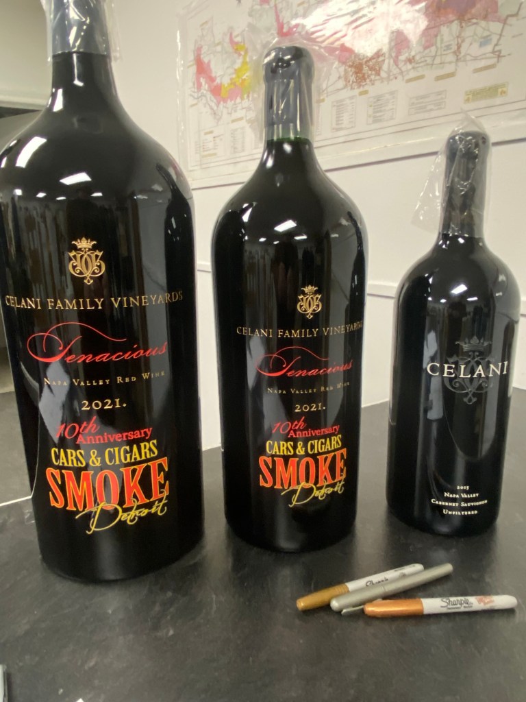 Then just to further tempt us a we were doing the tasting, there were three bottles of Celani Family Winery in large sizes, of which only five bottles were produced, and now they were the last of the offerings, while two were colored and etched bottles representing another charity event that is underwritten by Tom Celani. There was a Double-Magnum of the Celani Family Winery Cabernet Sauvignon Napa Valley 2015 which is three liters. Then an Imperial or a Methuselah of the Celani Family Winery Tenacious Napa Valley Red Wine 2019 which is six liters. The last of the big bottles was a Salmanazar of the Celani Family Winery Tenacious Napa Valley Red Wine 2019, which is nine liters or the equivalent of one case of wine.