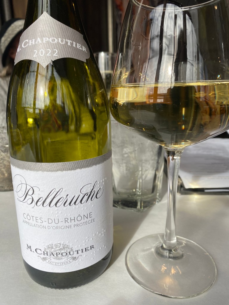 After our drinks, we started looking at the lunch menu, but ended up ordering from the dinner menu, I guess we are just anarchists at heart. The Caller had his Sausage Rustica, Italian sausage pan seared with sautéed banana peppers and onions. My Bride had the Butternut Ravioli stuffed with Butternut Squash puree, walnuts and mushrooms in a creamy Marsala-sage sauce. I had the Shrimp Luca, lightly breaded jumbo shrimp that was flash fried with fresh vegetables and polenta, finished with a lemon-garlic-cream sauce. We shared a bottle of M. Chapoutier Belleruche Cotes-du-Rhone Blanc 2022. The Chapoutier family has been in the Rhone since 1808 and have transitioned from just a grower to a Bwinemaker and a negociant, and a genuine force in the area and France; not to mention that they have holdings now in three other countries beyond France. They have also included Braille embossing on their labels for some time now, since their estate in Hermitage was originally owned by the creator of the modern version of Braille. The Belleruche label is their popular priced wine and readily available at many restaurants. The wine is a blend of White Grenache, Roussanne, Viognier, Clairette and Bourboulenc grown on vineyards of stony marls and clay-limestone hills. The fruit is mechanically harvested at night, light maceration, with fermentation at cool-controlled Stainless-Steel tanks, and five months on the lees. A soft golden-yellow colored wine that offers notes of apricots, fennel and irises. On the palate there were tones of citrus, pears and dried fruits, fresh and balanced with a medium finish with a trace of anise.