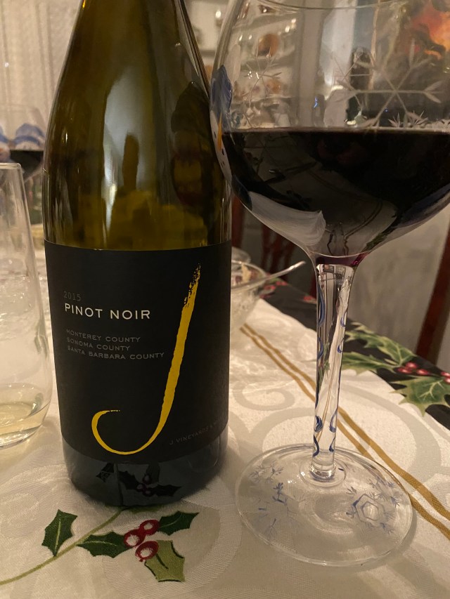 My Bride had made her signature dishes of Caesar Salad, Armenian Pilaf and her Bourbon and Brown Sugar Salmon. I knew our guest’s wife likes red wine, so I went with a bottle of J Vineyards & Winery Black Label Monterey-Sonoma County-Santa Barbara Pinot Noir 2015. The winery began in 1986 by Judy Jordan, the daughter of Tom Jordan, founder of Jordan Vineyard & Winery fame. The father and daughter team began as equal partners, until the daughter was able to buy out her father and she became sole proprietor. Originally, I only knew the winery for their sparkling wine and for the first ten years they only produced the J Vineyard Brut and what a fine job they did with it. In 2015 E&J Gallo bought J Vineyards & Winery and maintained the winemaker. The wine is a blend of Pinot Noir from three areas: seventy percent of the fruit came from the Olson Ranch in Santa Lucia Highlands in Monterey County and I have been praising the Pinots from that region for some time, twenty-six percent of the fruit came from the Russian River Valley and four percent was harvested from Santa Maria Valley AVA in Santa Barbara County. The different wines were aged for six to seven months in a mix of French and American Oak, then blended and bottled. The wine was a deep dark garnet color and offered notes of dark plums, vanilla and anise. On the palate this medium-bodied wine showed tones of plums and rose petals and finished with a medium count finish of fruit and a trace of terroir.