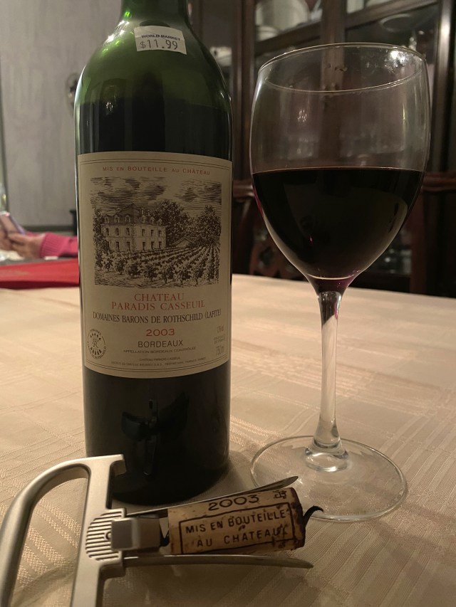 I am kind of picking and choosing, thinking which wines may not age as well. I will start with Chateau Paradis Casseuil Bordeaux 2003 from the Domaines Barons de Rothschild (Lafite). The Chateau is located in the Entre-Deux-Mers (between two seas) where the Dordogne and Garonne Rivers meet. The “Vines of Paradise” derives its name from the terroir, a distinctive geological formation of sandstone, limestone, marls , claystone with lime nodules and multi-colored magnesium sandstone as well as being rich in calcium. The porous structure of the terroir is what allows the vines to stay cool during the hot summer season. The DBR Lafite family purchased the fourteen-hectare property in 1984, and in 1989 the estate grew by nine hectares, and in 2013 they acquired another thirty hectares. In 2024 they acquired another twenty hectares and its own winery and cellar. The original name of the vineyard is lost in lore, but they are pleased with the name. Using modern technology, fermentation occurs in temperature-controlled Stainless-Steel tanks for the gentle extraction of tannins. The berries are small, and the skins are concentrated with tannins and the fruit has a short maceration period. A small percentage of the wine is aged in oak, and the wine is predominately Merlot, Cabernet Sauvignon and a small amount of Cabernet Franc. The wine was deep purple with no foxing and offered notes of black fruit, cassis, oak and terroir. On the palate the fruit and the tannins had blended, but I was impressed that there was still some solid fruit for its age and a good medium count of terroir in the finish.