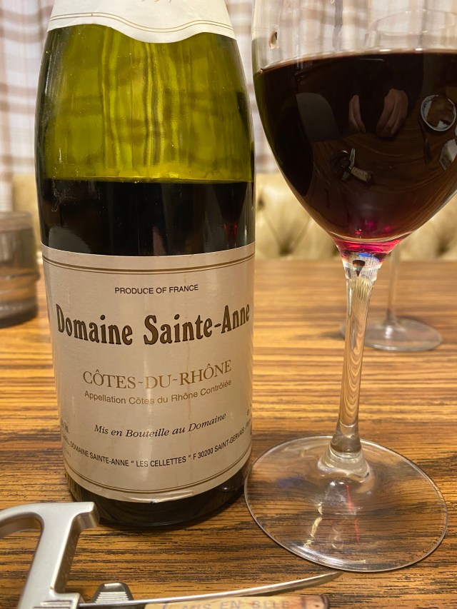 Another wine that we had one night at the house was Domaine Sainte-Anne Cotes du Rhone 2001. This is a low-key winery that is considered special in the southern Rhone. The Stenmaiers, originally from Burgundy were considered pioneers for introducing both Syrah and Mourvèdre to the area which was already famed for Grenache, which seems odd now, as The Rhone Rangers of California have made GSM almost a household blend. The winery also makes a Cotes du Rhone Blanc and their vines average about forty years in age. The wines are made in Stainless-Steel tanks as they use no oak. The color of this wine was still a deep purple with no foxing, but I am glad that we opened it up as the nose was starting to soften the notes of blueberry, raspberry and plums. On the palate the aging of the wine had softened the tannins and fruit, both were still present, but not a full-flavored and full-bodied for this higher proof wine.
