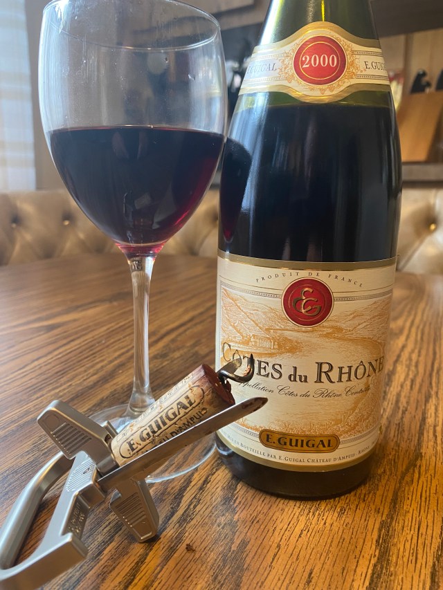 The last of the wines that I will mention today is also from the southern Rhone from a well respected house. We had opened an E Guigal Cotes du Rhone 2000. E. Guigal is one of the more popular and important producers in the Rhone Valley. Etienne Guigal founded the company in 1946 in town of Ampuis near the fabled slopes of Cote Rotie. The main focus has been on wines featuring Grenache, Mourvèdre, Viognier, Roussanne and Syrah. The company has holdings in Saint-Joseph, Hermitage, Gigondas, Condrieu, Chateauneuf-du-Pape, as well as a couple of Cote du Rhone wines. The company also has four notable wines from Cote Rotie, the latest acquisition being Chateau d’Ampuis in 1995. While the bottle of wine did not list the varietals, I don’t think that I would be going out much on a limb to say that it is the classic GSM blend of Grenache, Syrah and Mourvèdre, the classic trio of the Southern Rhone wines. I am happy to say that the color, nose and taste would have reminded one of perhaps a five-year-old and not a twenty-four-year-old, so the others are still safe and totally drinkable. The deep purple wine offered notes of blackberry, raspberry, pepper, smoke and sous-bois. On the palate nice tones of blackberry and raspberry, roasted peppers, and smoky spices.