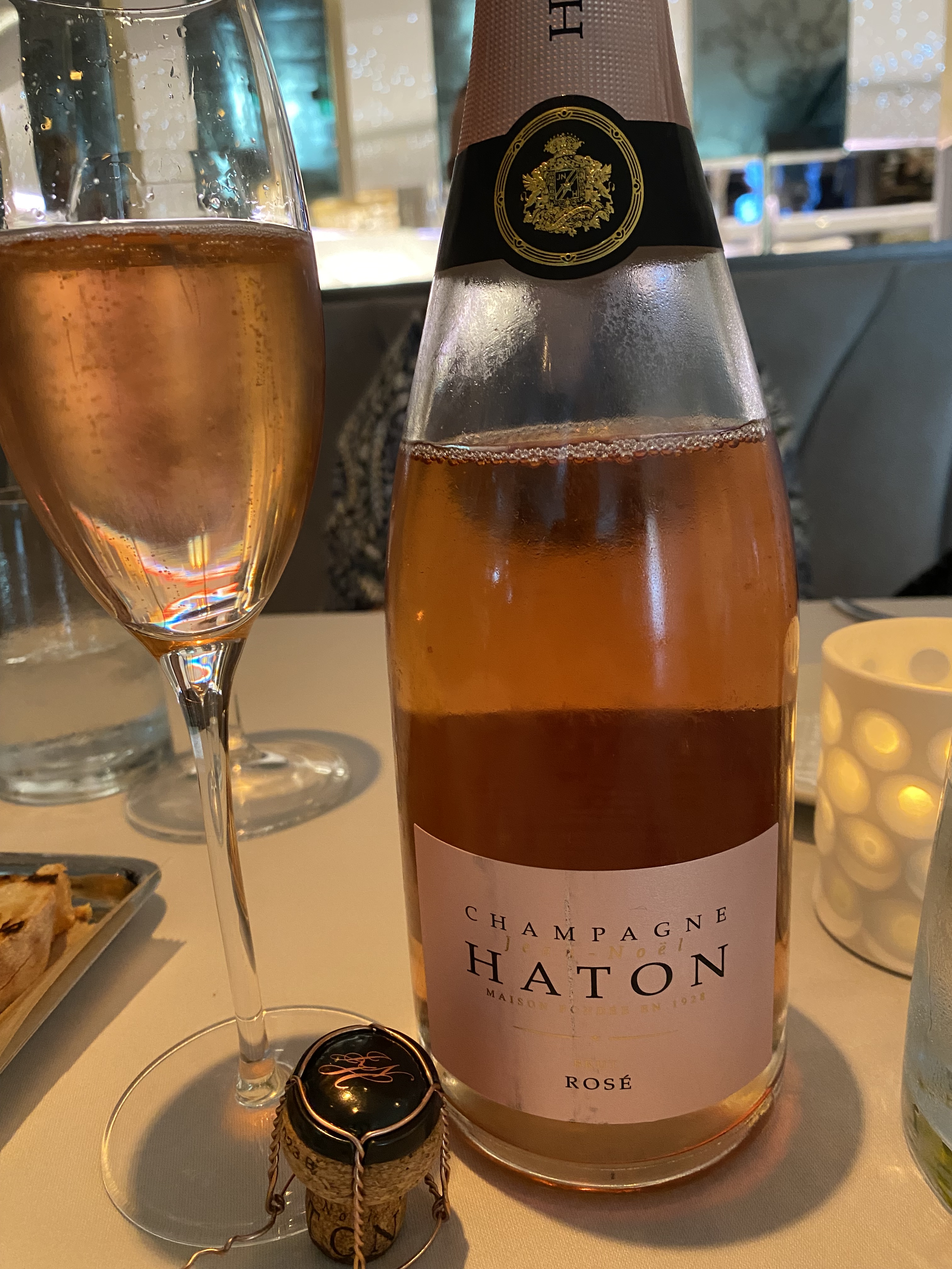 Palomar, was one of the “private” restaurants that we paid a surcharge and had to make reservations for a table and time.   The theme was Mediterranean and my Bride started with an Heirloom Beet Salad with Feta Cheese, Mint and Roasted Garlic, while I had Grilled Prawns with an Endive-Fennel Salad.   We began the meal with Champagne Jean-Noel Haton Rosé NV.  Champagne Haton began in 1610 with the original parcels of land in Damery.  Octave Haton began a new chapter when he began vinifying his own Champagnes.  They now have sixty hectares of vines (forty-five of their own) spread over six villages, each with its own micro-terroir and varieties.  The wine is a blend of thirty-five percent Pinot Meunier, thirty percent Chardonnay, thirty-five percent Pinot Noir (of which ten percent is vinified as red).  The wine is aged for a minimum of three years.  A pretty soft-copper color that offered notes of currants, strawberry, stone fruit, and orange zest.  On the palate there were delightful tones of fresh fruit, citrus, a complex mixture of toast, a dash of pine resin and good medium to long count of fruit and brioche.