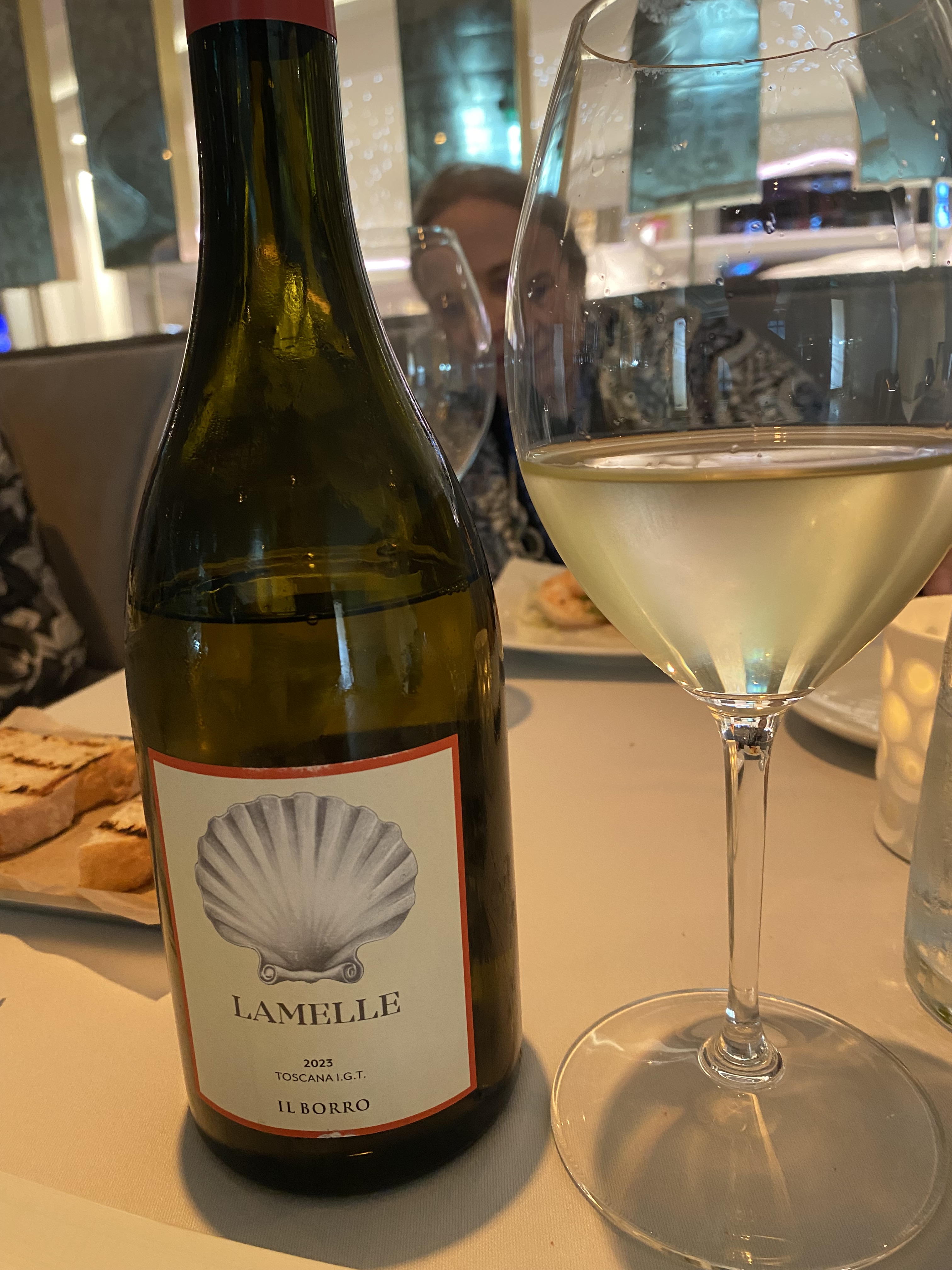 For our entrée choices, my Bride had the “Lavraki” Mediterranean Sea Bass, with Saffron-Carrot Puree and Chickpeas; while I had the “Festoni” Sea Scallops with Prosciutto, Le Puy Lentils, Clams and Pistachio Pesto.    We then followed with Il Borro Lamelle Chardonnay Toscana IGT 2023.   Il Borro is in the Valdearno hills of Tuscany planted primarily with classic international varieties, as well as Sangiovese. The vineyard is forty-five hectares and was planted in 1997 on a combination of sandstone and sandy-clay soils.  The vineyard is 300-500 meters above sea level.  The fruit is hand-harvested, and two-thirds of the juice is fermented in Stainless Steel vats, while the last third is divided among clay vats, acacia barrels, oak barrels and “Alma” which is a special oak and ceramic barrel. The wine is then aged for ten months on fines lees with an evenly split among clay vats, acacia barrels, oak barrels, and the “Alma” barrels.  The wine is then stored in the bottle for twelve months with a production of three thousand bottles.  A straw-colored wine that offered notes of citrus, yellow fruits, with a touch of rosemary, sage, and vanilla. On the palate the wine offered tones of fruit, with texture and body and finished with a nice medium count of fruit and terroir.