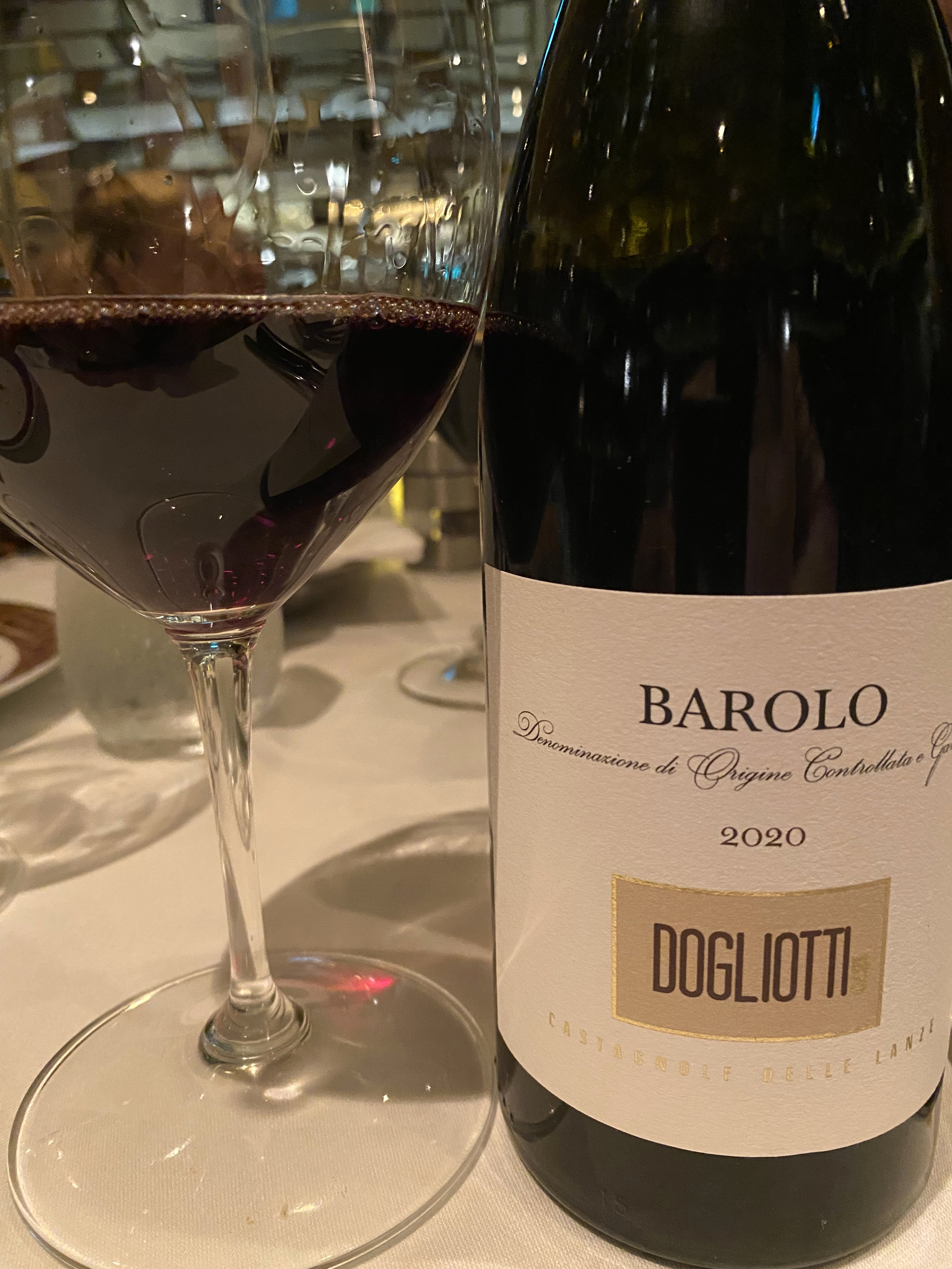 For my entrée I went with Double-Cut Lamb Chops with Pearl Barley Risotto and a Red Wine Sauce. I went with Dogliotti Barolo DOCG 2020. Giuseppe and Marcello Dogliotti began in 1870 in Castiglione, Piedmont and they became famed for their Moscato. In 1929 Luigi Dogliotti took over and moved the winery to the present Castagnole delle Lanze. The winery has continued to be a family business. Barolo by definition is made from the Nebbiolo grape and allowed in eleven “communes” in the Lange hills. The basic Dogliotti Barolo from them comes from all eleven “communes;” Barolo, Castiglione Falletto, Cherasco, Diano d’Alba, Grinzane Cavour, La Morra, Monforte d’Alba, Novello, Serralunga, Verduno and Roddi. Destemming, soft-pressing of the grapes, the Initial Fermentation and maceration on the skins is for about ten days with dedicated pumping to extract further color and aromas. The juice is then decanted twice to eliminate solids, before they begin the Malolactic Fermentation. The wine is matured in an assortment of different size oaken casks (from France and Slavonia) for about thirty months, with weekly tastings and topping off of the barrels. The total aging process is two years in oak casks followed by one year in bottle, before the wine is allowed to be distributed. The wine is a deep garnet color offering notes of black cherry, violets, roses, leather and spices. On the palate this was a full-bodied wine for such a young age, well balanced with tones of black cherry, sous-bois, rose petals with velvety tannins and a good medium count finish of fruit and terroir. It also was quite lovely with a Seven-Layer Chocolate Cake with Vanilla Ice Cream.