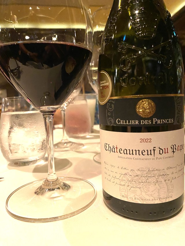 My Bride had a Filet-Mignon with Sauce Bearnaise and we shared sides of Sauteed Garlic Mushrooms and Creamed Spinach to continue with the steak house theme. She had Le Cellier des Princes Chateauneuf-du-Pape 2022. Le Cellier des Princes is a cooperative cellar that has been producing Chateauneuf-du-Pape since 1925; and they are the only group in the appellation. There are 180 winegrowers with vines cultivated from the five villages of the appellation: Courthezon, Chateauneuf-du-Pape, Sorgues, Bedarrides and Orange. Grenache is almost ninety-five percent of the production, and the balance is composed of Syrah and Mourvèdre (Monastrell). The soil is basically round pebbles and sand. The fruit is hand-harvested, destemmed, and a four-to-five-week period of maceration, with daily pumping. The wine is then aged for almost a year in concrete tanks, so there is no oak, as they are interested in allowing the purest expression of Grenache and terroir. This is a much fresher and lighter interpretation of Chateauneuf-du-Pape. A ruby red colored wine that offered notes of red currants, red cherries, blackberries, lavender and pepper. On the palate a medium-bodied wine with tones of strawberry, raspberry, cherry blending with silk tannins and a medium count finish of fruit, spices and terroir. She finished her meal with a Raspberry Crème Brulé with a Florentine crunch and chocolate twist.