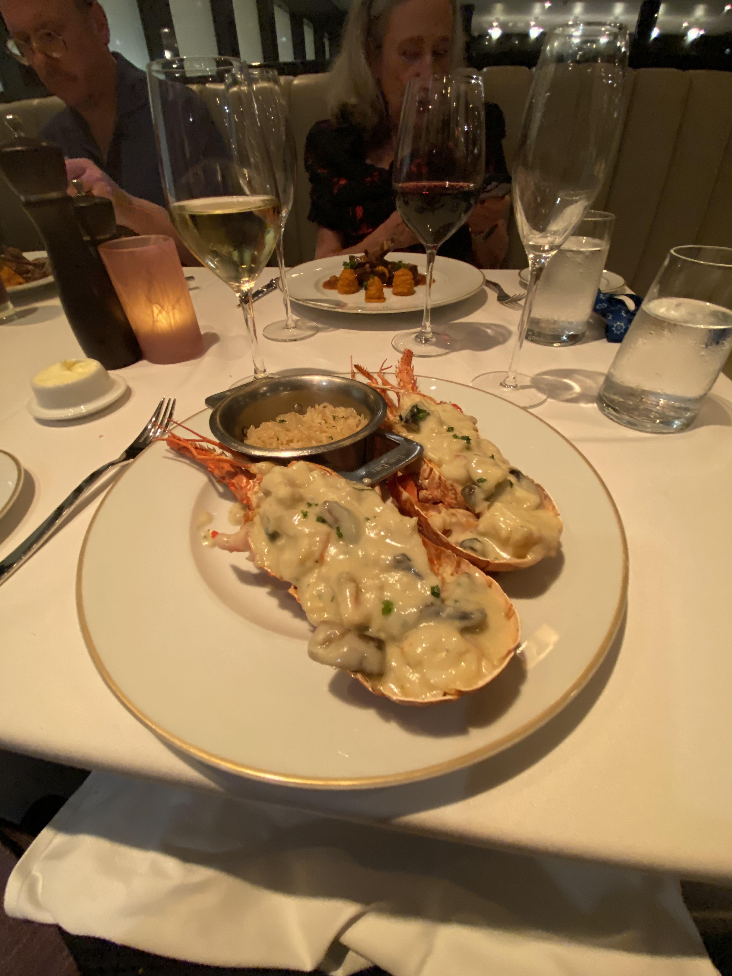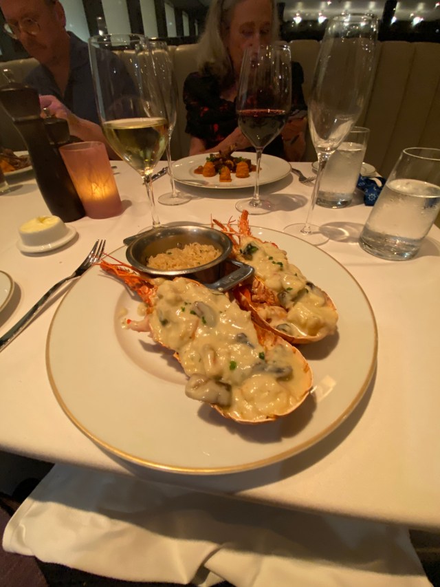 While we were enjoying the bubbles, my Bride and I shared two appetizers: Steak Tartare au Couteau which is hand-cut beef with traditional garnishes and a grilled baguette and an order of Escargots a la Bourguignonne with Herbed Garlic Butter. My Bride had “Carré d’Agneau Roti et Souris d’Agneau aux Saveurs Marocaines” or Braised Shank and Roasted Lamb Chop with Moroccan Spices, Dried Fruits, Sweet Potatoes and Cilantro. I had a dish that I hadn’t had since I was sixteen at Anthony’s Pier 4 in Boston, as I had “Homard Thermidor” or Lobster Thermador with a Mushroom Cream Sauce and Rice Pilaf; which even carried an additional surcharge for the dinner. We then were bad as we tried four different desserts with coffee: “Fraisier” Strawberries with Diplomat Cream and Pistachio-Almond Sponge Cake, “Marquis au Chocolat” Dark Chocolate Cremeux with Rice Crunch and Chambord Raspberry Sauce, “Poire Belle-Helene” Fortified Wine Poached Pear with Spices and Vanilla Ice Cream with Warm Chocolate Sauce, and finally “Ile Flottante” an Airy Meringue Pillow floating in Vanilla Crème Anglais and Raspberry Coulis. I have no idea how it happened, but we may have come home with maladies, but no additional weight.