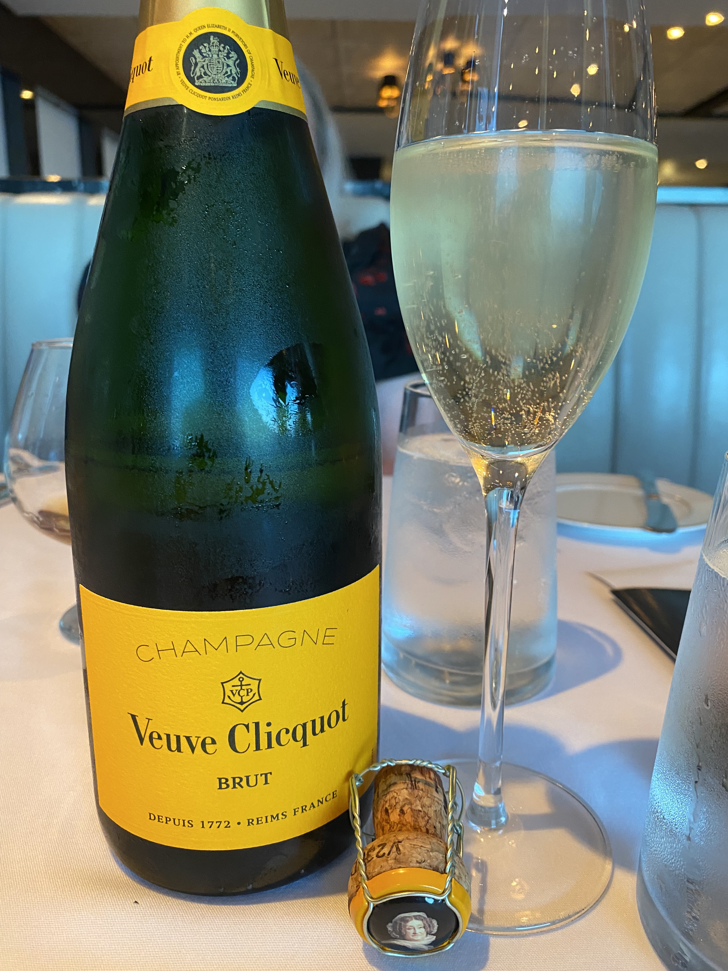 We enjoyed our last dinner at Le Bistro, one of the four themed restaurants that we paid for in advance. When in “France” we opened a bottle of Champagne Veuve Clicquot Brut Yellow Label Reims NV. Veuve Clicquot is one of Champagne’s best-known houses and founded in 1772. The house is also famed for inventing the process of riddling, which removed the dead yeast cells and the finished wines with a clear appearance. The house was started by Philippe Clicquot and later his son Francois married Barbe-Nicole Ponsardin in 1798, and they began taking over the wine business, but then came the Napoleonic Wars, and Francois died in 1805. Barbe-Nicolle continued on her own, including some smuggling of wines to Tsar Alexander I of Russia, and the brand took off from there. Veuve Clicquot is built upon chalk quarries established in medieval times and stretch for twenty-four kilometers, maintaining a perfect temperature and humidity and now listed as a UNESCO World Heritage site. Veuve Clicquot-Ponsardin is now owned by the luxury giant Louis Vuitton Moet Hennessy (LVMH). The Yellow Label is their emblematic cuvée and defines their signature of freshness, strength, aromatic richness and silkiness. The wine is predominately Pinot Noir with Chardonnay and a touch of Pinot Meunier, and it can blend with up to forty-five percent reserve wines (some four hundred wines, aged up to thirty years). The wine is a golden yellow with persistent fine tiny bubbles and offers notes of white and yellow fruit, citrus like mandarin and grapefruit and brioche. On the palate this is a fully structured wine where there are tones of pear, peach, dried fruit and a nice medium to long count of fruit and brioche.