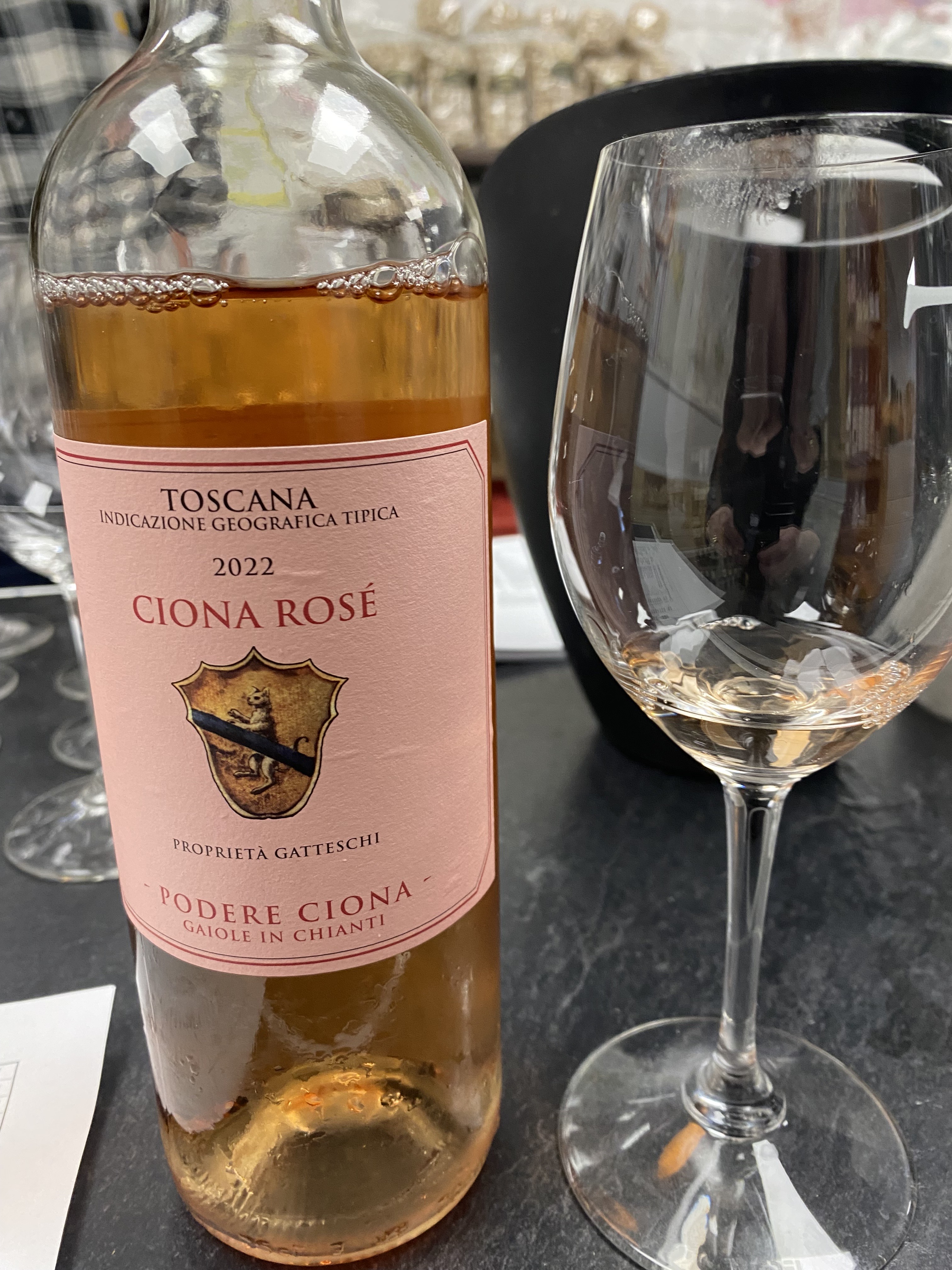 The final chilled wine of the tasting was Podere Ciona Ciona Rosé Toscana IGT 2022. I was reading the history of the winery on their website “Franca and Franco Gatteschi were looking for a place in the countryside to retire to, after many years of working in Italy and abroad, when they came across a small, beautiful, albeit run down property: 100 acres of land, mostly wooded with 10 acres set aside for cultivation, of which 2.5 acres already had vineyards; a house from the 18th Century, abandoned for more than 40 years; and, above all, a view without equal on the Chianti hills, with Siena in the distance.” It really sounds idyllic and makes one ponder how this property was neglected and ignored for years. “They purchased the estate at the beginning of 1990, and they immediately started the reconstruction work on the main house (it took nearly three years). They also set up a small but well-equipped wine cellar for making wine. In 1996 they permanently moved on the estate and the following year, the great 1997 vintage, saw the birth of the first “official” wine of Podere Ciona: A Chianti Classico DOCG Riserva.” The Rosé was made entirely of Sangiovese in the saignée method. The vines are from six to nineteen years of age and planted on quartz, clay schist and marl. The fruit is manually harvested in small baskets and then de-stemming, berry by berry for a slight crush in Stainless Steel vats for ten to twelve hours of skin contact and no Malolactic Fermentation. The wine is then aged for about six months in Stainless Steel and then further fined and bottle aged for six months before distribution. There were about one hundred-eighty cases produced of this wine. A pretty salmon-pink color with notes of fruit and spices, just a well-balanced light and easy drinking wine with a nice medium count finish offering terroir.