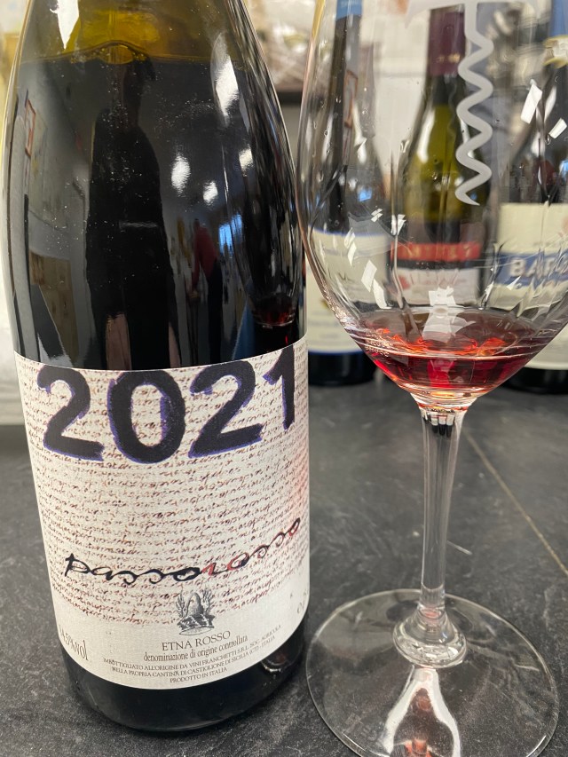 The next wine featured the island of Sicily. We were tasting Passopisciaro Passorosso Etna Rosso DOC Terre Siciliane IGT 2021, and until 2012 this wine was labeled Passopisciaro Rosso. Passopisciaro is a wine producer with vineyards on the lower northern slopes of Mount Etna and owned by the Tuscan winemaker Andrea Franchetti. Etna’s unique terroir is characterized by volcanic soils made from old lava flows, in combination with the high altitudes (up to 1,000m) above sea level, provides perfect growing conditions for Nerello Mascalese, the most popular varietal on the island. Passorosso is made exclusively with Nerello Mascalese blending across different altitudes and soil types (the higher altitudes have more gravelly soil, while the lower altitudes have deeper powder made from more oxidized, older lavas). The wine is vinified originally in Stainless-Steel vats for fifteen days, and then aged for eighteen months between a mix of cement vats and large oak barrels, and the wine is then bottled unfiltered. The ruby-red wine offered notes of red currants, juniper, cloves, camphor and sandalwood. On the palate this medium-bodied wine displayed tones of juicy ripe red fruit, a touch of smoke, dry tannins and a nice finish of fruit and terroir.
