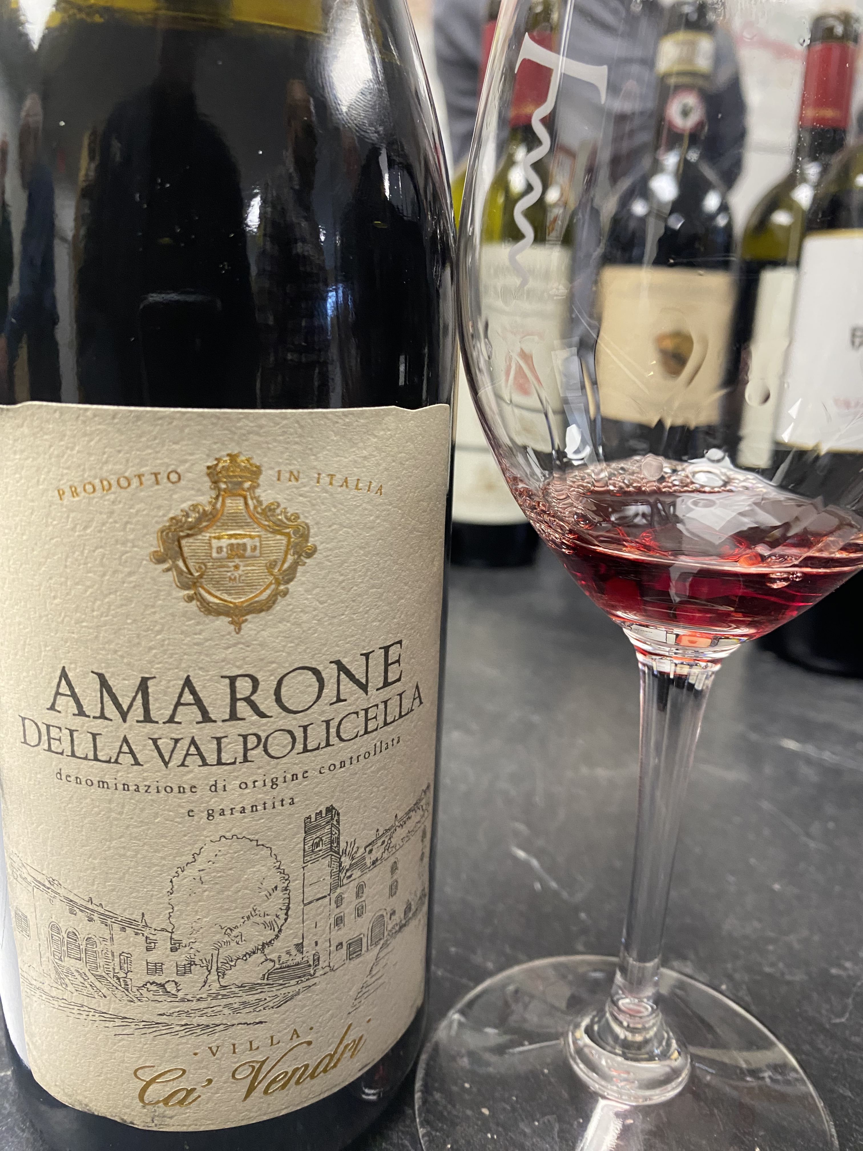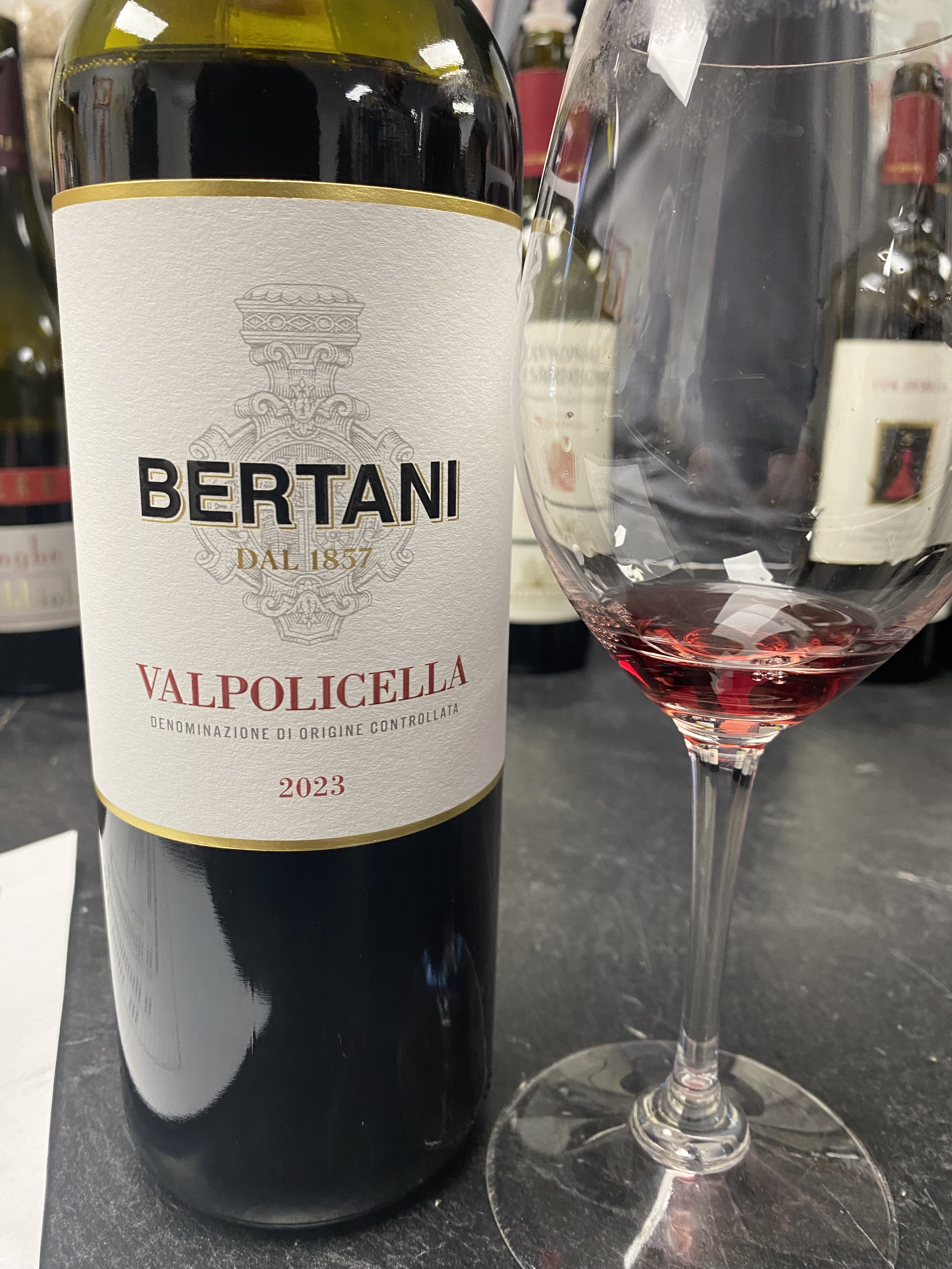 And the last four wines were all from the Valpolicella region of the Veneto district. First we had the Bertani Valpolicella 2023. Bertani was founded by two brothers in 1857 with a winery in Grezzana, Valpolicella Valpantena. They now have more than 200 hectares across the Verona region. The wine is a blend of eighty percent Corvina Veronese and twenty percent Rondinella. The fruit comes from the Tenuta Novare vineyards in the heart of the Valpolicella Classico area and from the Valpantena vineyards near Grezzana. There is two distinct soils, one of white limestone and the other of red limestone with Iron and Manganese. After destemming and crushing the must is fermented in wide and shallow Stainless-Steel tanks while on the skins. The wine is then aged in concrete vats covered with glass bricks, which allows constant temperature and micro-oxygenation. The wine is aged for about eight months, followed by an additional three months in bottles, before distribution. This was a red colored wine that offered notes of redcurrants plums, raspberries and sour cherries and some pepper and cinnamon. On the palate this medium-bodied wine displayed tones of red fruit blended with soft tannins and a short finish of fruit and spices.