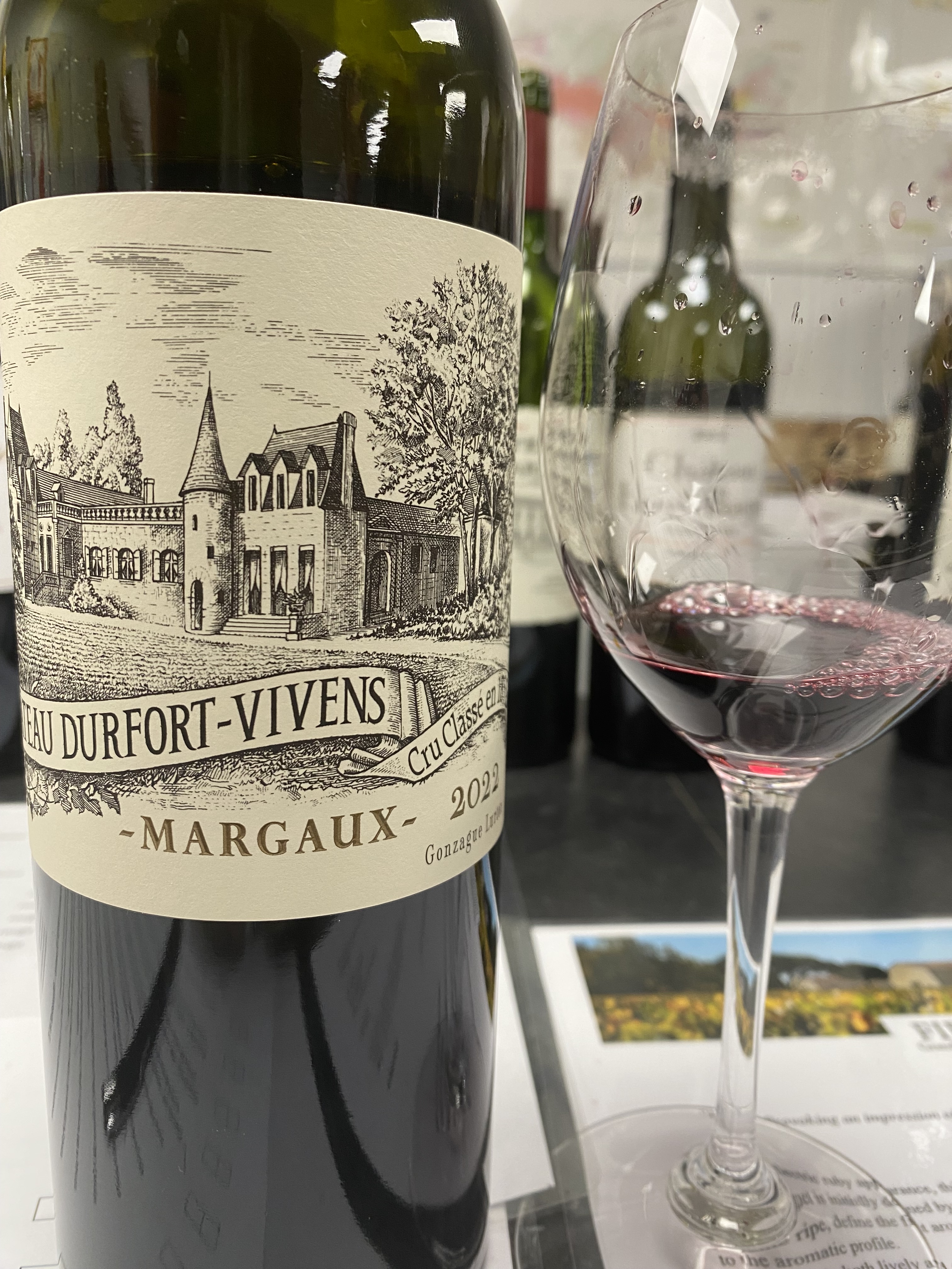 We then enjoyed Chateau Durfort-Vivens Margaux 2022, a Deuxiemes Crus (Second Growths) from the 1855 Classification of the Medoc. The estate was one that was visited by Ambassador Thomas Jefferson, before he became the President of the United States who rated the chateau just under Lafite, Latour, and Margaux. Like many other estates after the French Revolution, the chateau had many different owners until it was purchased by the Lurton family in 1937, who also at the time had a stake in Chateau Margaux. In 1962, Lucien Lurton bought the estate and in 1992, his son Gonzague took over, who revamped the cellars and converted the estate to organics and biodynamics. They now have a range of wooden and concrete vats sized to specific vineyard parcels. The estate is fifty-five-hectares of vineyards planted on deep gravel soil over a sand and clay base. This wine is a blend of eighty-four percent Cabernet Sauvignon and sixteen percent Merlot. The fruit was hand-harvested during three selective passes. Initial Fermentation was done with indigenous yeasts, with twenty-one days of maceration with pumping-over done daily. The wine was then aged for eighteen months using seventy percent new French Oak and thirty percent in amphorae. This was a deep ruby-red wine offering notes of black fruit, cigar box, cocoa, spices and minerals. On the palate this full-bodied wine displayed tones of black fruit, well-balanced, blended with tight tannins and a nice long count finish of fruit, terroir and a dash of spice; needs a few more years in the cellar.