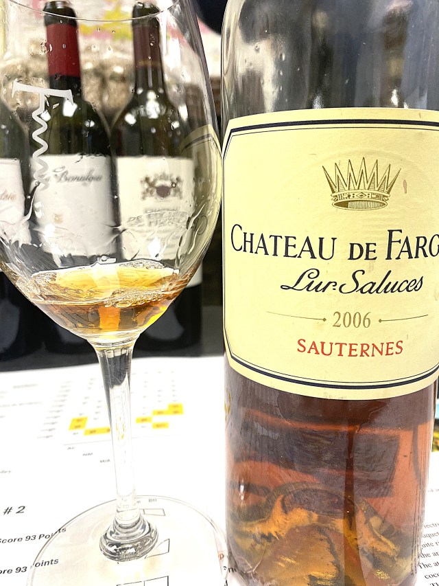 While there were ten wines on the printed sheet featured in the tasting, there was an eleventh wine that was served and the was Chateau de Fargues Sauternes 2006 from Chateau d’Yquem and I heard it referred to as “d’Yquem Jr.” Chateau de Fargues has been with the Lur Saluces since 1472 and today they only produce one wine, a classic interpretation of Semillon and Sauvignon Blanc from its vineyards around the village of Fargues at the center of the appellation. Originally, they produced both red and white wines at the twenty-five-hectare estate, but in 1928, they replanted for only white on clay-gravel soils over a layer of clay and hardpan soil. The first vintage was produced in 1943 and released in 1964. The fruit is hand-harvested and sorted to separate the “noble rot” from the “gray rot” and each day’s selection is pressed and fermented in oak barrels, with about thirty percent new). Racking takes place four times a year and the wine is tasted to see if they have a vintage year, and if so, the wine continues aging in oak for thirty months, with an additional six in the bottle. There were no vintages for 1972, 1974, 1992, and 2012. While Chateau d’Yquem was the only and still only Grand Premiere Cru, Chateau de Fargues was absent from the 1855 classification for Sauternes and Barsac, since they only started producing in 1943. While the Lur Saluces family had the chateau for three-hundred-years before they bought Chateau d’Yquem, and then recently sold it in 1999, the two estates were always under the same strict quality standards hence the “d’Yquem Jr.” This beautiful amber colored wine offered notes of sweet tropical fruits, florals, jasmine, saffron, and some “sous-bois.” On the palate a full-bodied wine with layers of candied fruits, quince, figs, saffron, and honey, beautiful acidity and a nice long finish caramel and terroir.