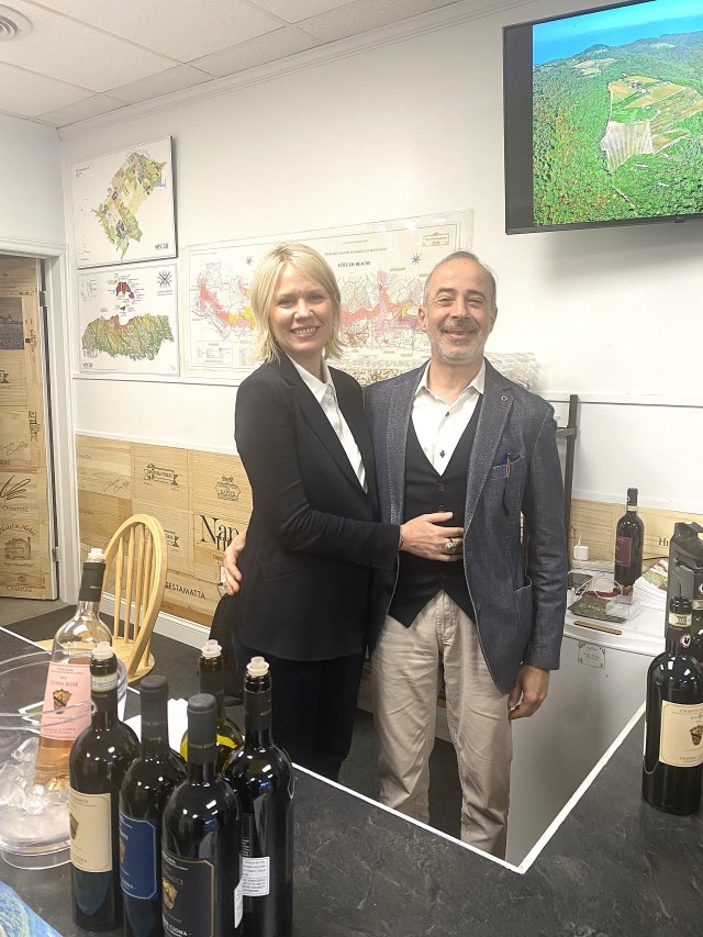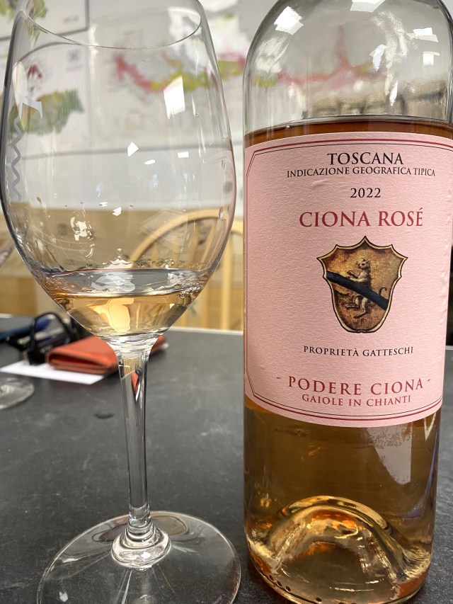 I have met Lorenzo Gatteschi many times at wine tastings, but this was the first time that I had the chance to meet his wife, Jennifer. In the new part of the shop, they now have a tasting counter, and there is even a computer monitor above to show photos and features of the wines being tasted. Lorenzo was working one end of the counter and Jennifer was working at the other end, so she had to endure my quirks. As I started to take my first photo of a glass of wine and the adjacent bottle label, Jennifer surprised me and asked if I was “the Wine Raconteur” as she also handles the social media for the winery. I was flattered to say the least. The first wine for the tasting was Podere Ciona Ciona Rosé Toscana IGT 2022. The Rosé was made entirely of Sangiovese in the saignée method. The vines are from six to nineteen years of age and planted on quartz, clay schist and marl. The fruit is manually harvested in small baskets and then de-stemming, berry by berry for a slight crush in Stainless Steel vats for ten to twelve hours of skin contact and no Malolactic Fermentation. The wine is then aged for about six months in Stainless Steel and then further fined and bottle aged for six months before distribution. There were about one hundred-eighty cases produced of this wine. A pretty salmon-pink color with notes of fruit and spices, just a well-balanced light and easy drinking wine with a nice medium count finish offering terroir.