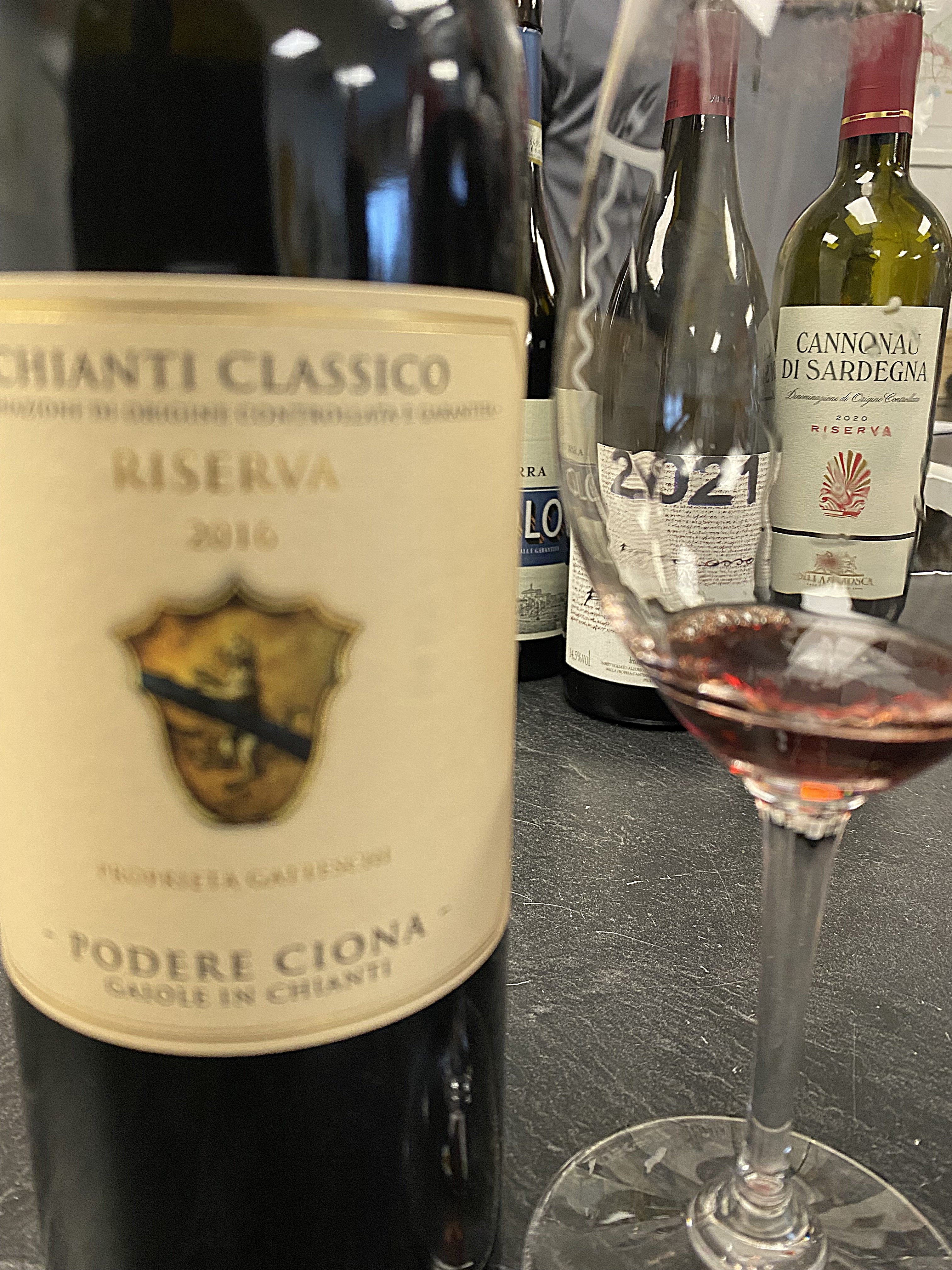 I have met Lorenzo Gatteschi many times at wine tastings, but this was the first time that I had the chance to meet his wife, Jennifer. In the new part of the shop, they now have a tasting counter, and there is even a computer monitor above to show photos and features of the wines being tasted. Lorenzo was working one end of the counter and Jennifer was working at the other end, so she had to endure my quirks. As I started to take my first photo of a glass of wine and the adjacent bottle label, Jennifer surprised me and asked if I was “the Wine Raconteur” as she also handles the social media for the winery. I was flattered to say the least. The first wine for the tasting was Podere Ciona Ciona Rosé Toscana IGT 2022. The Rosé was made entirely of Sangiovese in the saignée method. The vines are from six to nineteen years of age and planted on quartz, clay schist and marl. The fruit is manually harvested in small baskets and then de-stemming, berry by berry for a slight crush in Stainless Steel vats for ten to twelve hours of skin contact and no Malolactic Fermentation. The wine is then aged for about six months in Stainless Steel and then further fined and bottle aged for six months before distribution. There were about one hundred-eighty cases produced of this wine. A pretty salmon-pink color with notes of fruit and spices, just a well-balanced light and easy drinking wine with a nice medium count finish offering terroir.