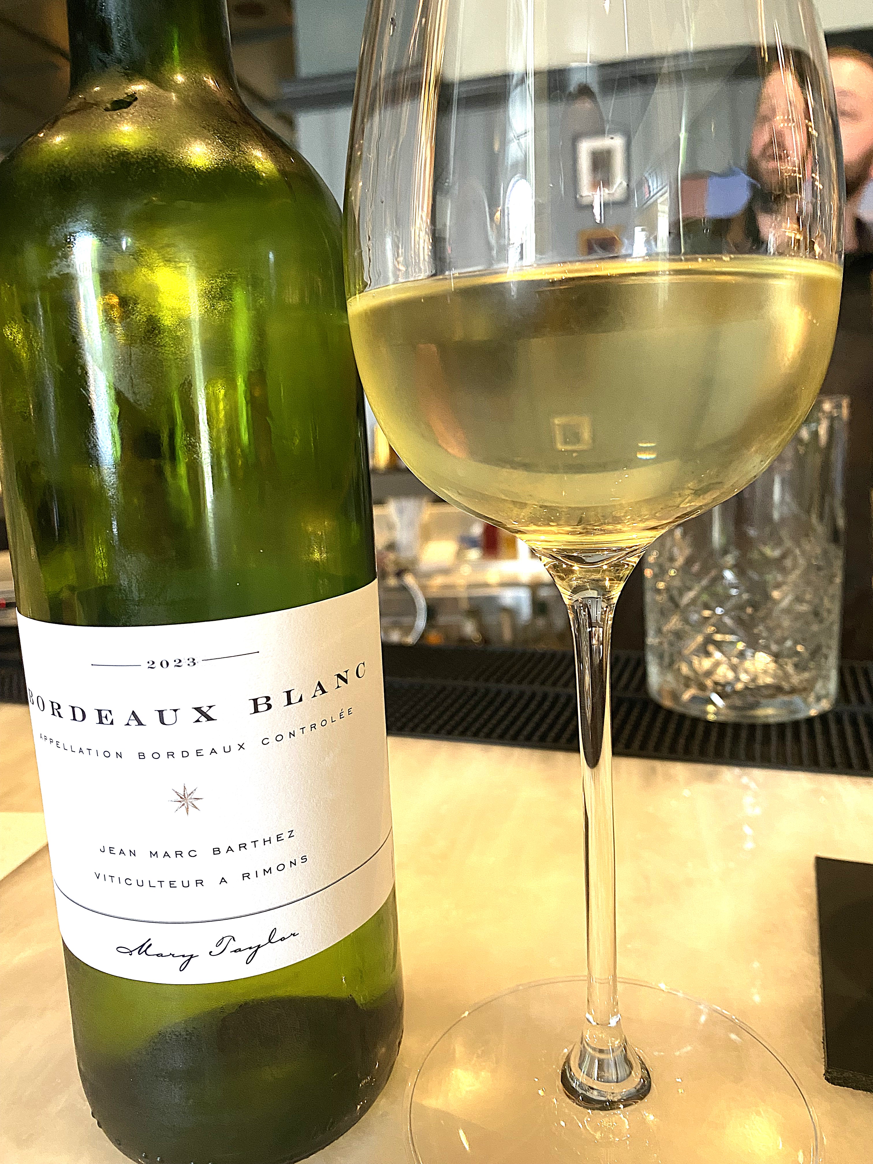 You may have noticed that we occasionally will just belly-up to the bar for a drink or two, and if there is something to nosh-on, all the better. We got a charcuterie board and some Smoked Trout Rillettes. I selected two different white wines for us, the first was Mary Taylor Wine “Jean Marc Barthez” Bordeaux Blanc 2023. Mary Taylor Wine represents the two decades of working in the European wine industry. She prefers the European system of “place name” or appellation and tries to offer the terroir of the region. Jean Marc Barthez, besides being her winemaker for this region, is also the president of a small cooperative winery in the village of Monsegur in the Entre-Deaux-Mers subregion with their alluvial sand and clay-limestone soils. The wine is ninety-five percent Sauvignon Blanc and five percent Semillon; and the age of the vines are thirty years of age. The wine undergoes fermentation and aging in Stainless-Steel tanks. A rather soft-golden yellow wine that offered notes of melons, white fruits, citrus and white florals. On the palate this medium-bodied wine was well balanced and displayed notes of green apples, pink grapefruit, citrus zest and a nice medium-count finish of fruit and terroir.