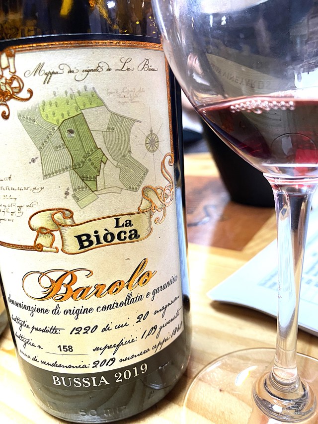 The next wine we tried was La Bioca Bussia Barolo 2019. La Bioca is a small winery in the Langhe near Serralunga d’Alba. The winery has eight hectares of vineyards located in Monforte d’Alba, Novello, La Morra and Barbaresco. This wine is pure Nebbiolo, and the fruit is hand-harvested, destemmed and cold maceration for a few days. The wine undergoes fermentation in Stainless-Steel tanks without temperature control for seven days with regular punching down and pumping over: with secondary maceration for twenty-five days. The wine is then aged for a minimum of eighteen months in oak casks. A deep garnet colored wine that offered notes of black cherries, blood oranges, violets and a whiff of cinnamon. On the palate this full-bodied wine displayed tones of black cherries and other black fruit, citrus, and spices blended with velvety tannins, bright acidity and ending with a long count finish of fruit, spices and terroir.