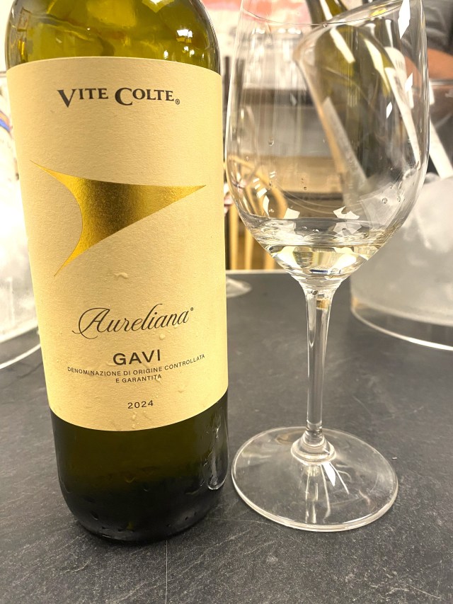 We started the session off with Vite Colte “Aureliana” Gavi 2024; and depending on the market the wine could be labeled as Terre da Vino brand. The winery was founded in 1980 and is situated below the most prestigious Barolo cru vineyards and the architectural design has been reviewed by many modern architecture periodicals. The wine is pure Cortese grape and comes from vineyards with alluvial soils with silty clay sediments and interspersed with reddish brown grit. The grapes are soft pressed, and the must ferments in temperature controlled Stainless-Steel vats, followed by a short aging period on the lees, also in Stainless-Steel vats to maintain the freshness and the fruit. The soft straw-yellow wine offered notes of green apples, ripe pears, white florals, freshly cut hay and a touch of anise. On the palate this medium-bodied wine displayed tones of the green apples and pears, well-balanced with crisp acidity and ending with a medium-count finish of fruit and subtle minerality.