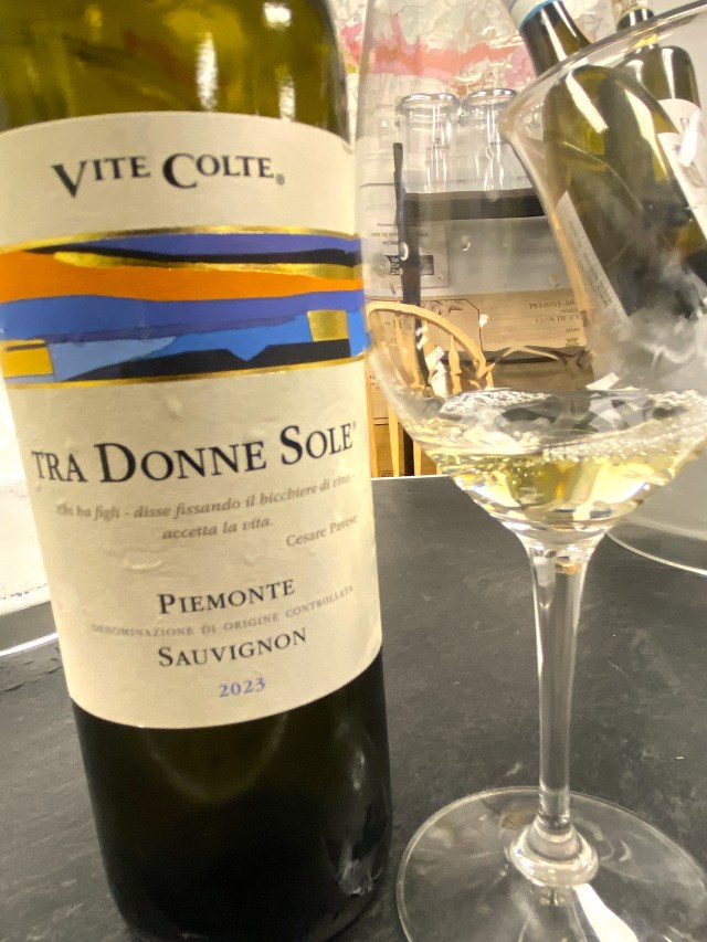We then went with the Vite Colte “Tra Donne Sole” Sauvignon (Blanc) Piedmont 2023 and over the years this wine has carried both the Monferrato DOC and Piemonte DOC. The wine “Tra Donne Sole” (The Lonely Woman) is named after a work by Cesare Pavese. The members of Vite Colte ad their families, partners and winegrowers are the cornerstone of a modern winery with a combined goal to maintain the high standards that are part of the Piedmont tradition. The vineyards for this wine are located in two different areas with different soils and microclimates, and also low yields, and these points are used to create a complex and balanced wine, as the regions ripen at different times. The earlier vineyard have grapes that are higher in acidity and have class aromas of Sauvignon, while the later vineyard displays tropical fruit. Ater the grapes are pressed, the juice is allowed to ferment in temperature-controlled Stainless-Steel vats and then the wine rests on the lees for three months until bottled. A straw-yellow colored wine offered notes of pears, apples, passion fruit, gooseberry, citrus and white florals and grass. On the palate this medium-bodied, well-balanced wine displayed tones of grapefruit, baked apples, vanilla with a touch of mint and licorice in an unfussy and very easy drinking wine that ended with a medium-count finish of fruit and terroir.
