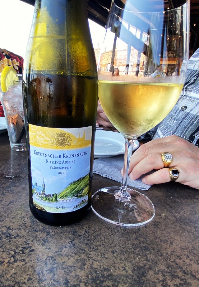 Later on, we walked the downtown Port Huron district admiring the architecture of the buildings and then we ended up at the Vintage Tavern, which is not on the water, but the restaurant up on the second floor, one could observe the water way and the ships and boats, plus we could hear the horns for the two drawbridges as they would stop automobile and foot traffic to allow boats onto the rivers from the lake. It was a shame that we really weren’t that hungry even with all of the walking and stairclimbing, because the restaurant has a great menu and wine list. We just noshed, though my Bride did have a bowl of Pickle Soup, along with the Smoked Salmon Spread. The restaurant has a small wine carte, and we had Privatkellerei St. Antonius Biroth Kreuznacher Kronenberg Riesling Auslese Nahe 2023. The winery is located in the small wine village of Schweppenhausen in the Nahe region and known for Riesling wines. The winery is owned by Anton and Stephan Biroth. There are 4100 hectares of vineyards in Nahe, basically planted on clay overlays of sandstone and known for long, warm summers. A golden colored wine that offered notes of pears, apples and plums. On the palate this medium-bodied wine with low acidity displayed tones of pineapple, mango, apples and pears, a dry wine with a splash of sweet, that ended with a medium-count finish of fruit, honey, petrol and slate. Not a terribly indicative example of a Riesling Auslese, but very reasonably priced, even at a restaurant.