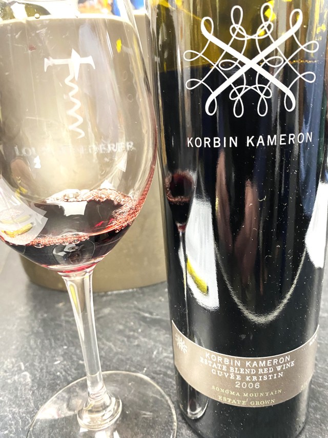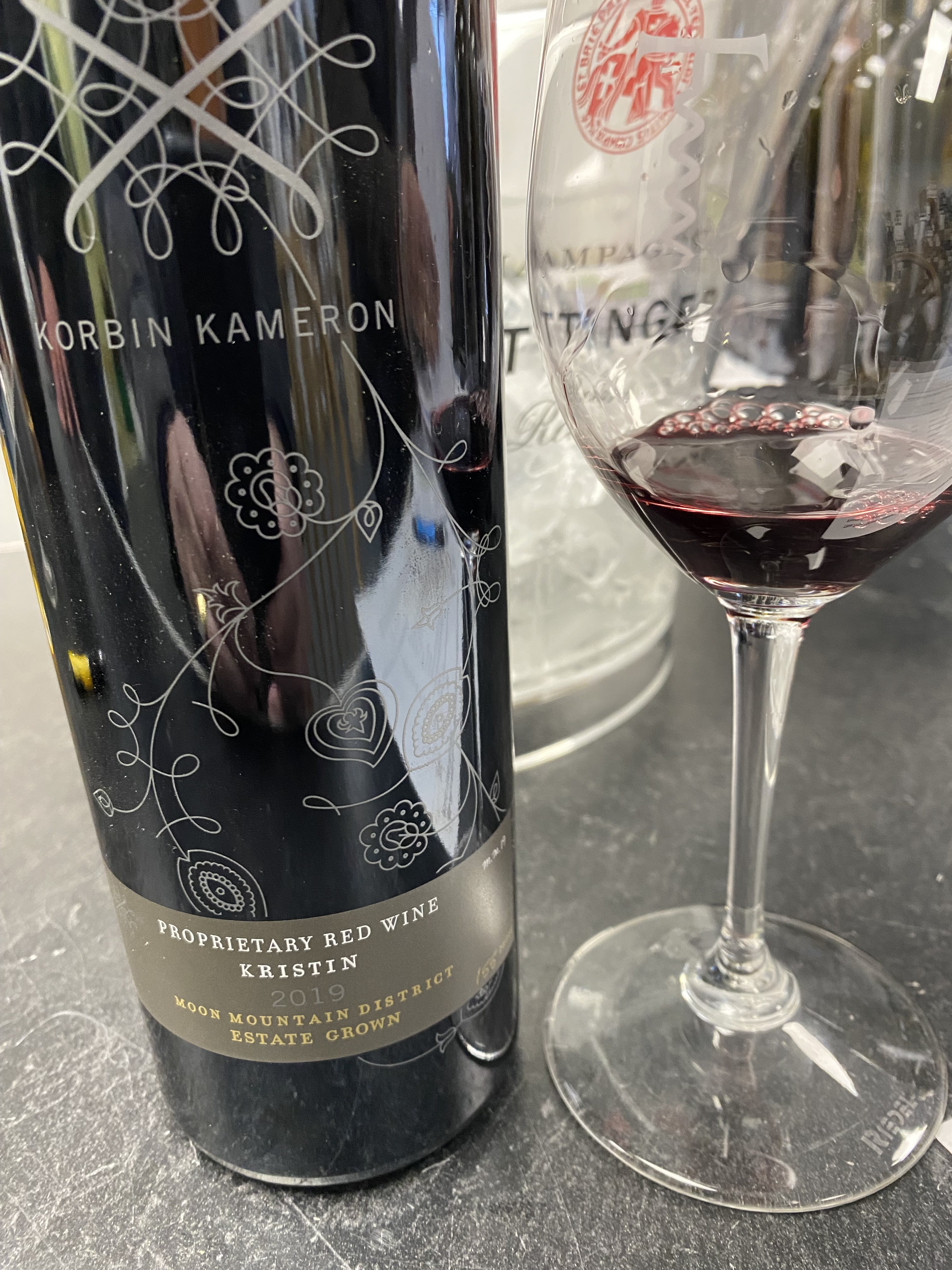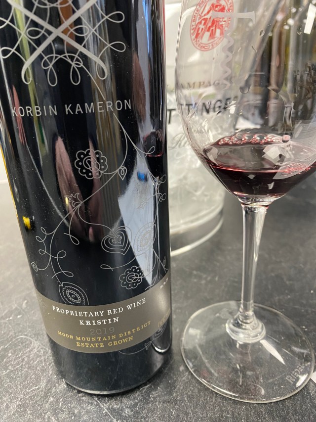 The third wine of this series was Korbin Kameron Cuvee Kristen Proprietary Red Wine Moon Mountain District 2019 from Moonridge Vineyards.  The wine is a Bordeaux-style blended wine of Cabernet Sauvignon, Merlot, Petit Verdot, Cabernet Franc and Malbec.  The wine was aged for eighteen months in French Oak, of which seventy-five percent was new.  There were one hundred fifty-five cases produced.   This deep ruby-red wine offered notes of blueberries, cherries, figs, rhubarb, roses and sous-bois.  On the palate this full-bodied and well-balanced wine displayed tones of blueberries and cherries with secondary tones of cola and pink peppercorns blending with firm tannins leading to a long-count finish of fruit, spices and terroir.