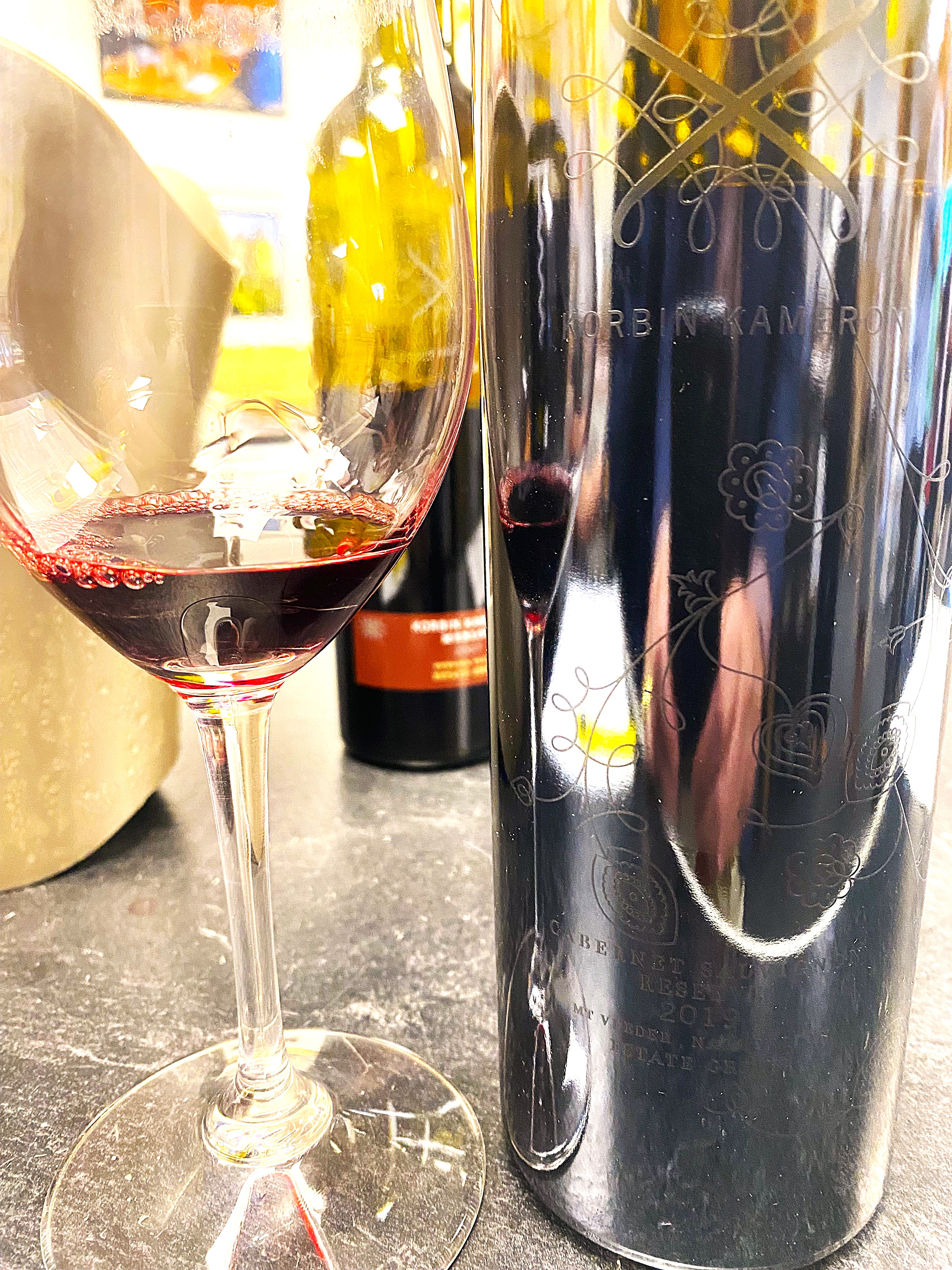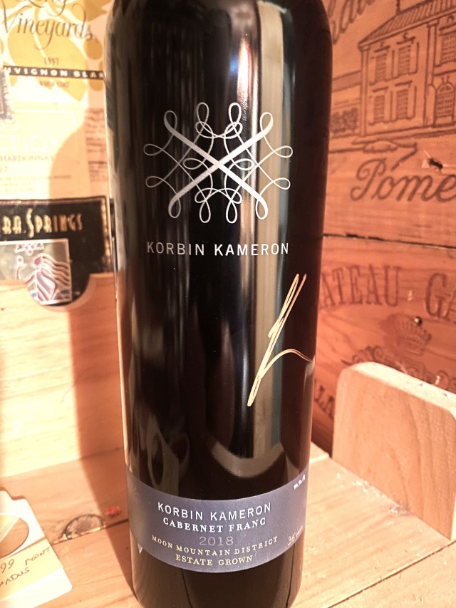 We had been tasting wines from their estate vineyard on Moon Mountain District which is on the Sonoma County side; the western slopes of the Mayacamas mountains between the Sugarloaf Ridge and Carneros. We started off with Korbin Kameron Reserve Cabernet Sauvignon Mount Veeder Napa 2019; and Mount Veeder is located on the eastern slopes of the Mayacamas mountains. This wine was aged for eighteen months in French Oak, of which seventy-five percent was new, and they produced fifty cases. A deep, dark garnet-colored wine that offered notes of black fruit, cassis, cedar and sous-bois. On the palate this was also a big chewy wine offering tones of blackberries, black cherries, currants, vanilla, oak and black pepper blending with big tannins, great acidity and a long count of concentrated fruit and terroir.