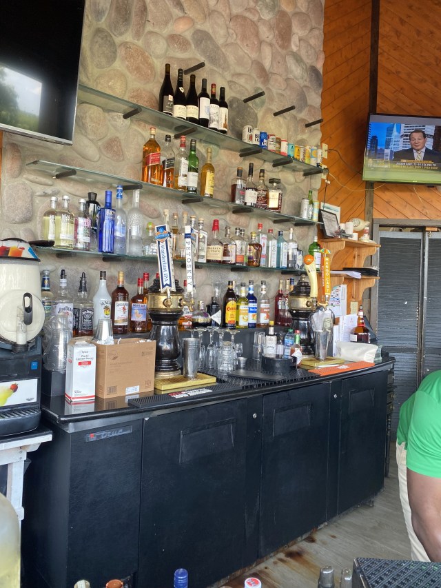 We took a leisurely walk to the far end of the downtown district and went to Mission Point which started out as Mackinac College created by Rex Humbard and was a non-denominational Bible school. The dormitories are now used by all the seasonal help that work in all the different businesses on the island, and the actual school, became a resort. We walked down to Bistro on the Greens, which is downhill from the resort and overlooking the Straits of Mackinac on a small par-three putting course, which in the evening is illuminated and fun. The Bistro has some bar food and drinks which is more than adequate, as the island is for good times. My Bride wanted a Margarita, which I think made the Gods send a swarm of bees to the Bistro while we were there. Actually, I think the bees are part of the locals, they just got more concentrated as more food and drinks were being served.