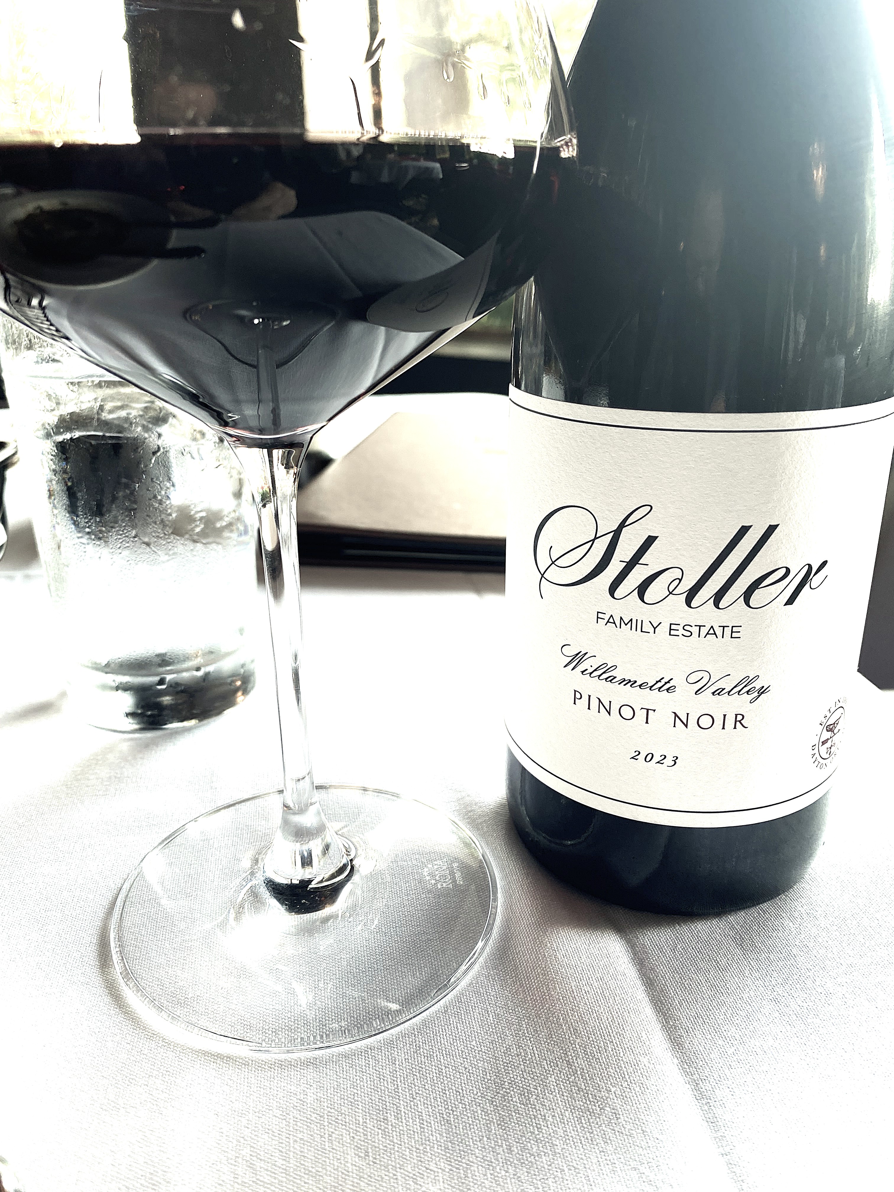 For our entrées the menus arrived with a salutation of “Happy Birthday!” as my Bride always tries to see if there is something special done by the house. My Bride had the Chilean Sea Bass with stir-fried Asian vegetables, Bamboo rice, and a Ginger-Miso citrus Beurre Blanc. I am becoming a creature of habit also, as I had Braised Short Ribs with Fingerling potato hash, roasted Brussels Sprouts, Butternut squash and a house-made Demi-glace. Afterwards we had our decaffeinated coffees and shared a Chocolate Tarte with salted caramel and Vanilla bean ice cream. We then started with Stoller Family Estate Pinot Noir Willamette Valley, Oregon 2023. Stoller Family Estate began as a second-generation family farm in 1943 to raise turkeys, and in 1993 Bill Stoller acquired the property from his father and uncle with the vision of a winery. The vineyard is the largest contiguous vineyard in Oregon’s Dundee Hills and comprises 400 acres with 225 acres dedicated to vines with an elevation of 210 to 650 feet. The south-facing vineyard is planted on Jory, a fertile and well-drained red soil that is the Dundee Hills. The Pinot Noir grapes start as a cluster that are sorted and removed unwanted materials, then destemmed, the whole berries go into tanks at cool temperatures for about ten days. The Initial Fermentation usually takes five to seven days, and then the wine is pressed. The wine is then aged for about ten months in French Oak and then bottled. This deep burgundy colored wine offered notes of black cherry, cassis, cedar and sous-bois. On the palate this medium-bodied well-balanced wine displayed tones of rich brandied cherries, ethereal tones of soil, blending with supple tannins and ending with a medium to long-count finish of fruit and terroir.