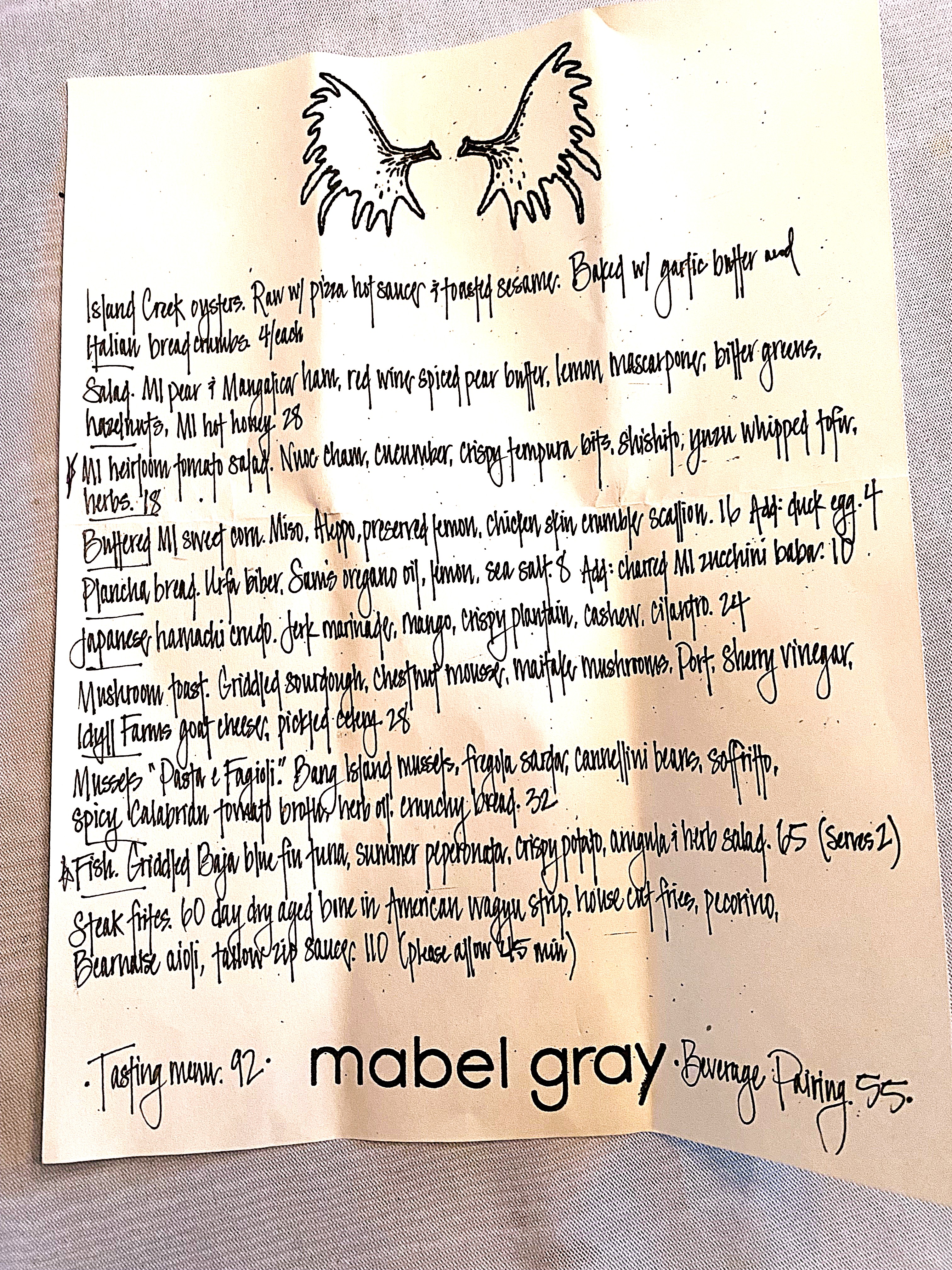 A couple that we tend to go out for dinner with suggested the restaurant Mabel Gray for an evening out. My Bride and I first discovered Chef James Rigato when he had a charming restaurant in a strip center years ago called Root in White Lake Township. He also was in a documentary film with another chef that we have followed Luciano Del Signore called a “Dinner in Abruzzo: A Journey Home with My Culinary Godfather.” I had been hesitant to try the restaurant, not because of the quality, but because there was this veil of mystery involving the menu and the tasting menu. I have been a fan of tasting menus since my first with Thomas Keller at The French Laundry, followed by the likes of Jean Georges and Daniel Boulud. The difference being that they published their tasting menu ahead of time, so that one could be concerned if they have food allergies or dislikes. I sent an email for some clarification and was told that if I had a problem, it could be corrected that evening.